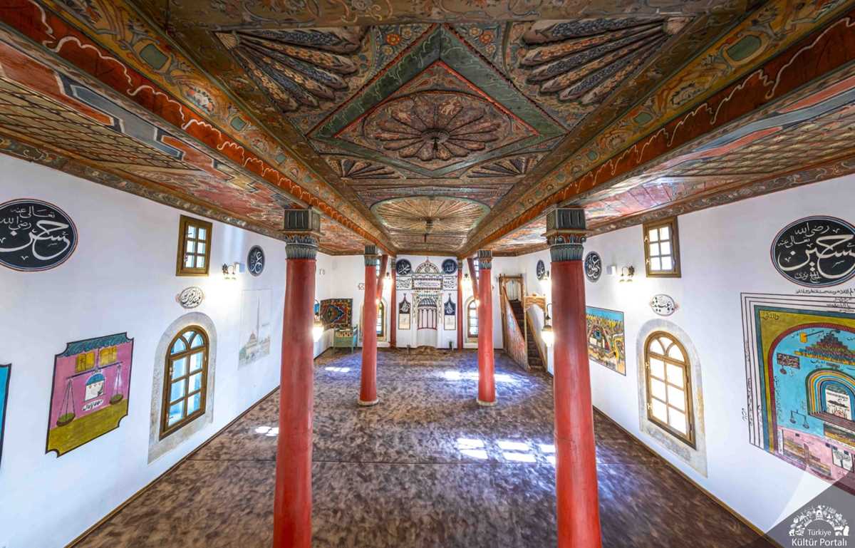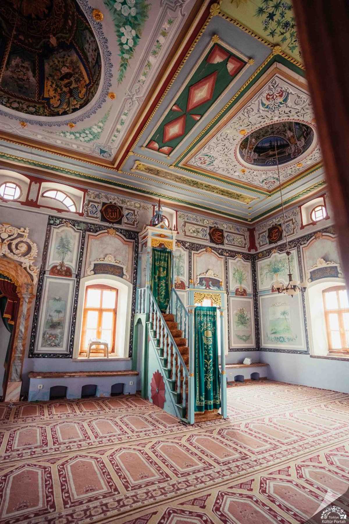 Afyonkarahisar’ın Sandıklı ilçesinde bulunan cami, 1379 yılında inşa edilmiştir. Caminin içindeki süslemeler 19. yüzyıl Osmanlı mimarisinin süsleme özelliklerini yansıtır. Duvar resimlerinde çam ağaçları, sarmaşıklı çiçek motifleri, kıvrık dallı ağaçlar, su kovaları, vazolu ve sepetli çiçekler, asma yaprakları ve üzüm salkımları arasındaki vazoların üzerinde girland motifleri görülür. Duvarlara ve kubbeye ayetler ve dini yazılar bezenmiştir. Kubbede Sultanahmet ve Tophane Camii tasvirleri de bulunur. Bunlar, devrin perspektif anlayışına göre minyatür tipte yapılmıştır.