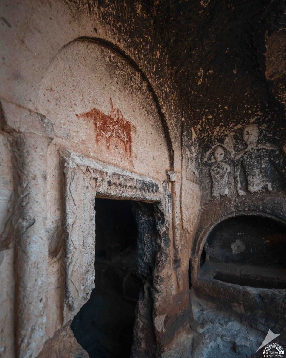 Bu görkemli mezar odalarının giriş bölümlerinde figürlü ve geometrik kabartmalar, yazılar ve kök boya ile yapılmış tasvirler göze çarpmaktadır. Girişlerindeki estetik, iç bölümlerdeki mezarların çevrelerinde de görülmektedir. Anıtsal görünümlü kaya mezarlarından birinin kapı girişi üzerinde yer alan, kırmızı aşı boyasından yapılmış süvari tasviri günümüze kadar korunarak ulaşmıştır.