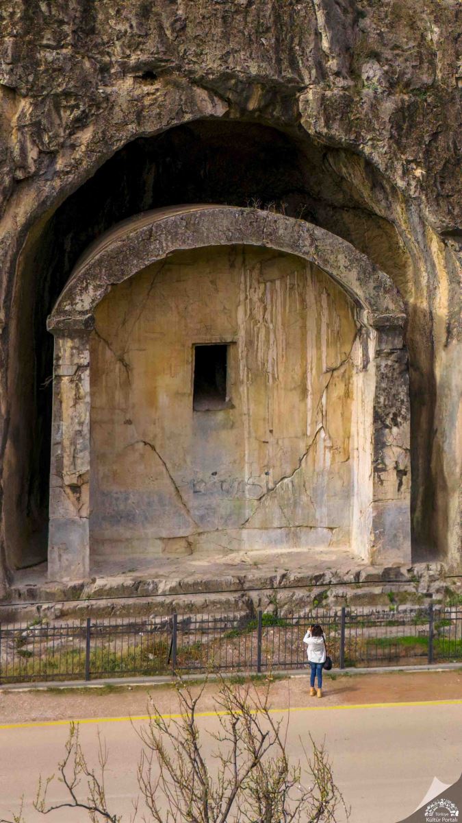 Amasya’da bulunan kaya mezarlarının en iyi işlenmiş ve tamamlanmış olanıdır. Yerden dört basamakla çıkılan anıtsal mezar, düz bir kayaya oyulmuştur. Usta bir taş işçiliği ile yapılmış anıtın genişliği 9.8 metre, yüksekliği 13 metredir. Dış cephesi perdahlanmış olan mağaraya güneş vurduğu zaman parladığı için buraya Aynalı Mağara denmiştir.