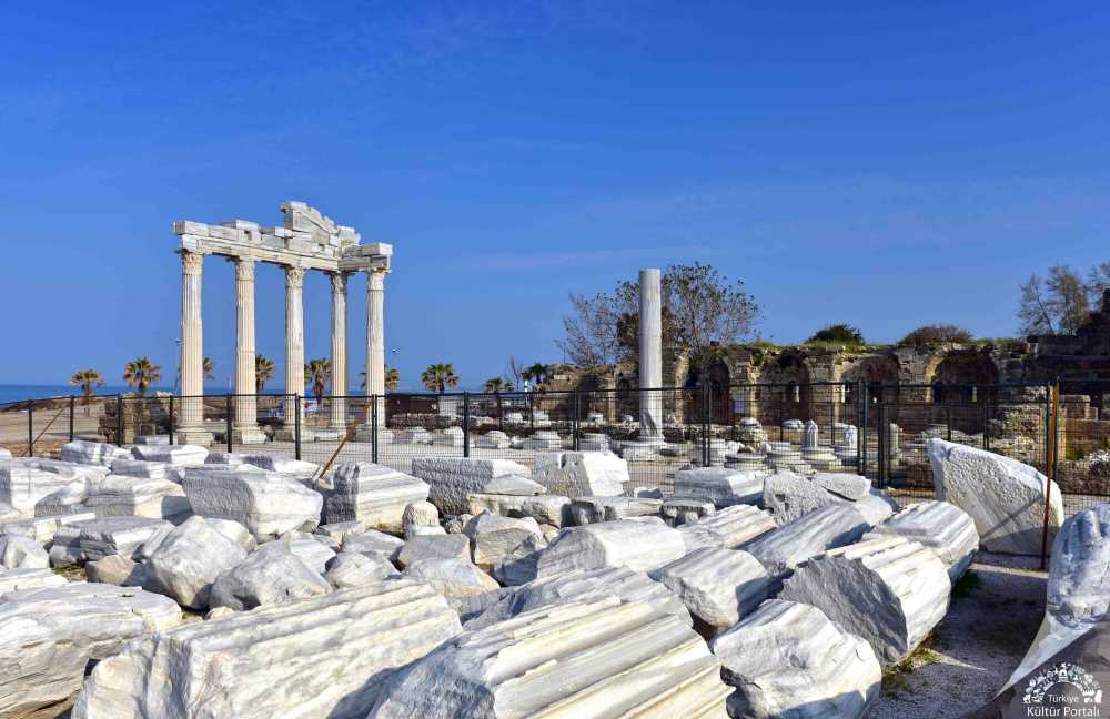 Kentin sütunlu caddesinin sonunda ve antik limanın hemen girişinde Apollon Tapınağı yer alır. Side ile özdeşleşen bu tapınak, hemen yanı başındaki Athena Tapınağı ile birlikte Roma Barışı olarak bilinen dönemde, Side’nin baş tanrısı ve baş tanrıçası adına yapılmıştır.