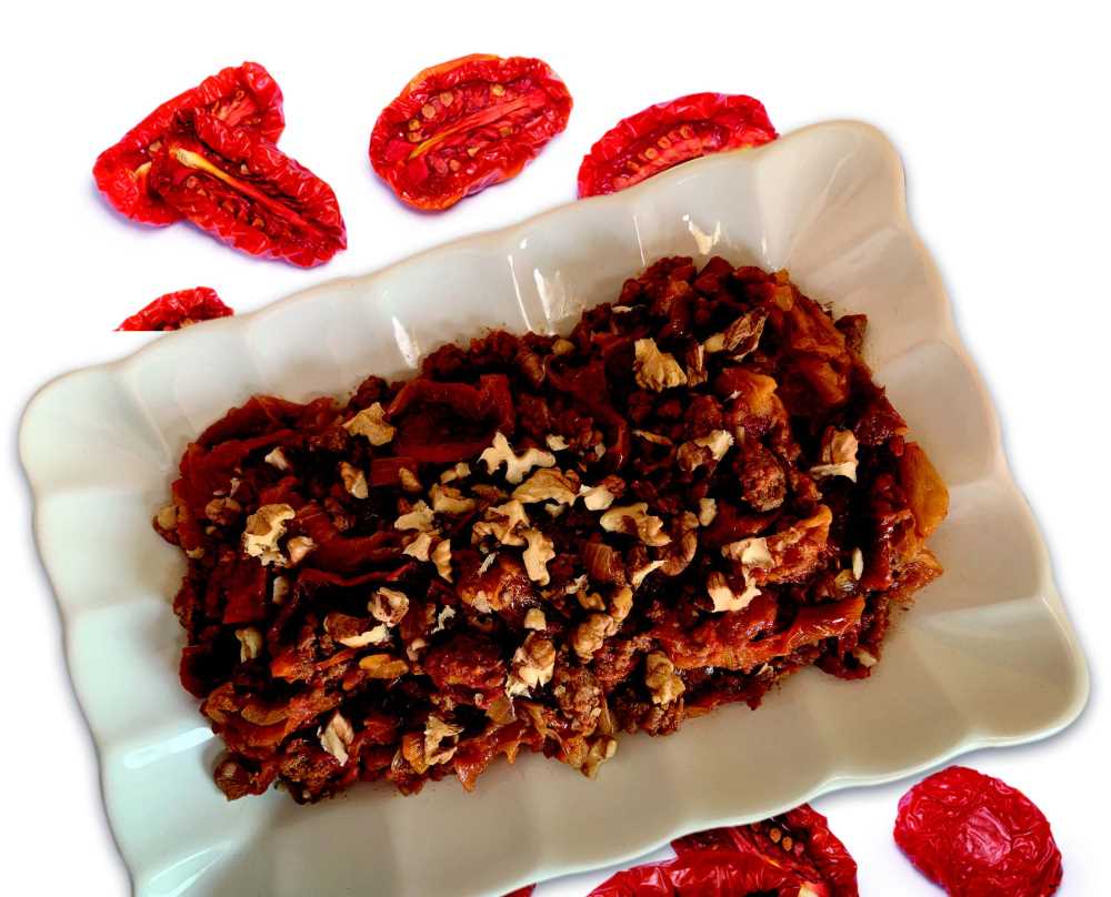 Genellikle kış mevsiminde yapılan yemeklerdendir. Soğan ince doğranır. Diğer taraftan domates kurusu sıcak suda bir saat bekletilip doğranır. Sırasıyla ile soğan, domates kurusu, ezilmiş sarımsak, salçalar ve kıyma eklenip yağda kavrulur. Yanmaması için yarım çay bardağı su ve tuzu katılıp pişirilir. Sunum tabağında üzerine dövülmüş ceviz içi dökülüp servis edilir.