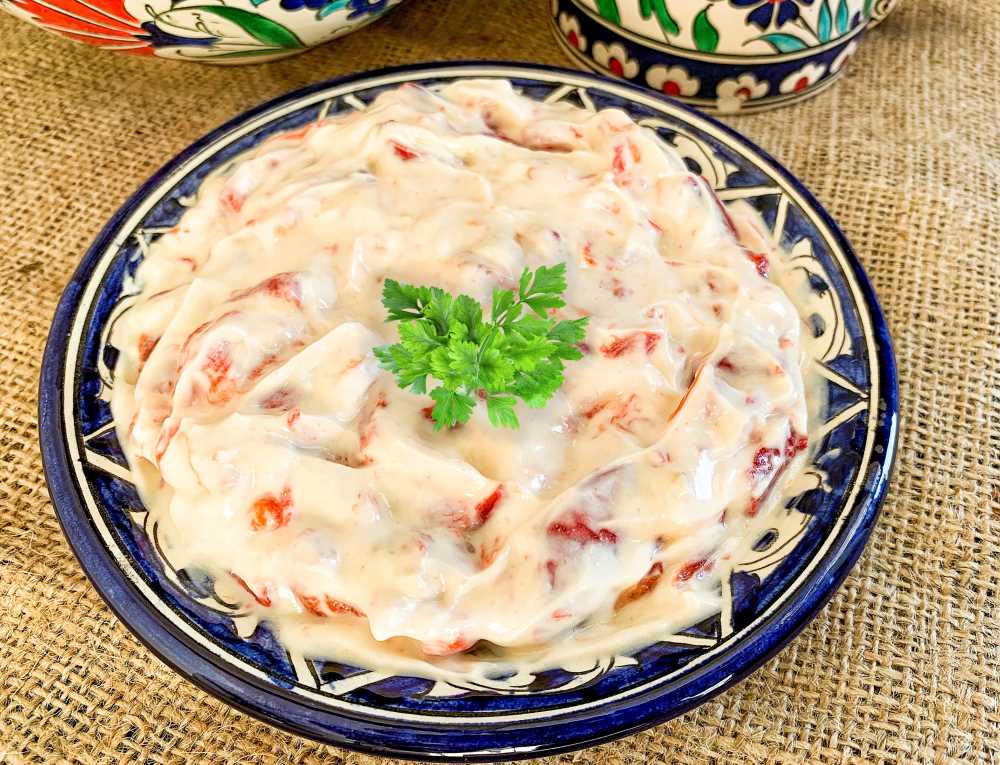 Yıkanıp durulanan kırmızı biberler ateşte közlenip kabukları soyularak küp küp doğranır. Bir kâse içinde süzme yoğurt ile tuz ve sarımsak rendesi çırpılır, kıvam su ile isteğe göre inceltilir. Biberler hazırlanan sos ile karıştırılır ve sunum tabaklarında isteğe göre üzerine zeytinyağı dökülüp sunulur.