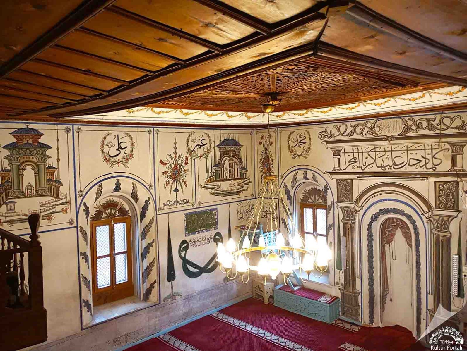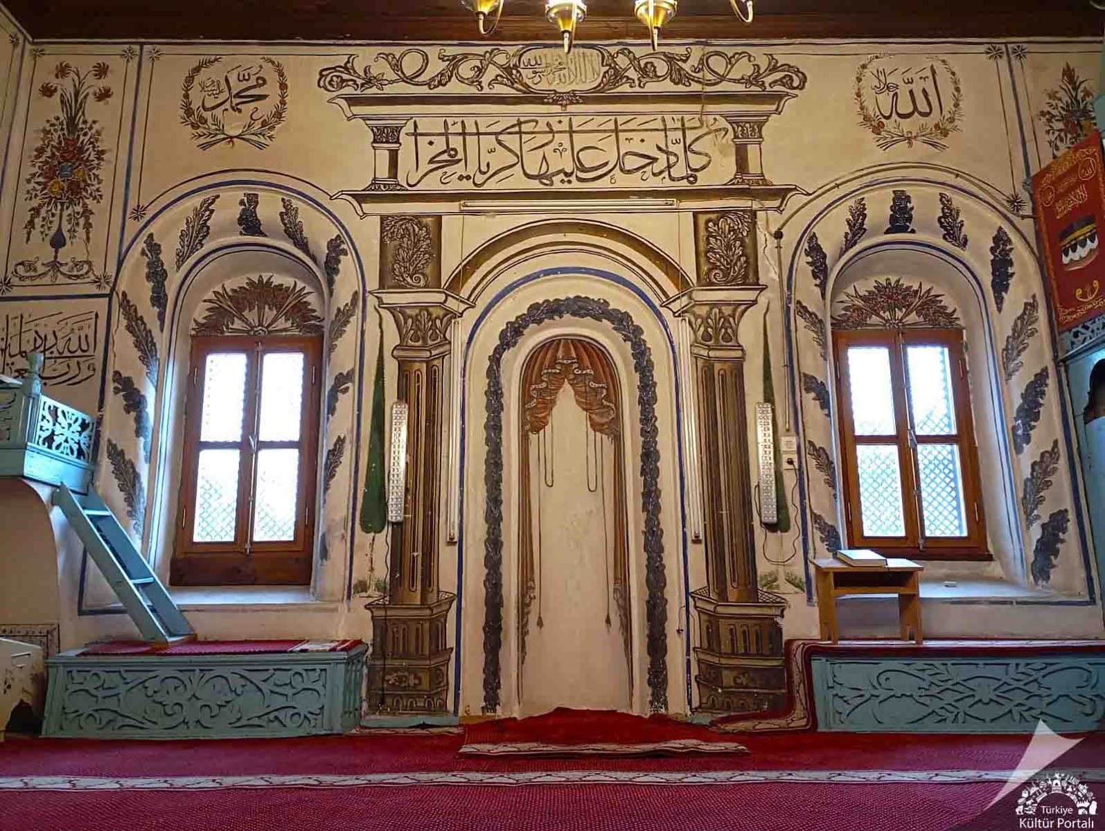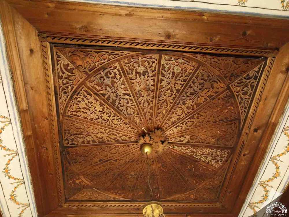 Caminin ahşap tavanı, içten çıtalarla bölümlere ayrılarak çeşitli motiflerle süslenmiştir. Bu motiflerin benzeri ajur tekniği ile yapılmış olan minberde de görülmektedir. Caminin ahşap süslemeleri dönemin ağaç oyma işçiliğinin güzel bir örneğidir.