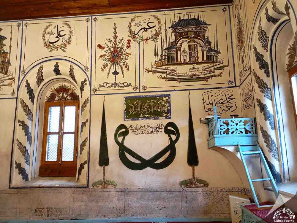 Caminin içerisinde kalem işleri ve ahşap süslemeler bulunmaktadır. Kalem işi süslemeler harim duvarındaki panolarda, pencere kenarlarında ve mihrapta görülür. Mihrapta açılmış perde motifiyle iki yanında birer sütun ve selvi motifi vardır. Pencere nişlerinin kenarları yapraklarla süslenmiştir. Pencerelerin doğu ve batı köşelerinde vazodan çıkan çiçek motifleri; kuzey duvarda selvi ve dal motifleri yer alır. Doğu ve batı duvarlarda panolar vardır. Bu panolara çiçekli vazolar, yapılar, yazılar ve Kâbe tasviri yapılmıştır. Son cemaat yerinin güney duvarının üst kısmında da harimdekine benzer panolar bulunur.