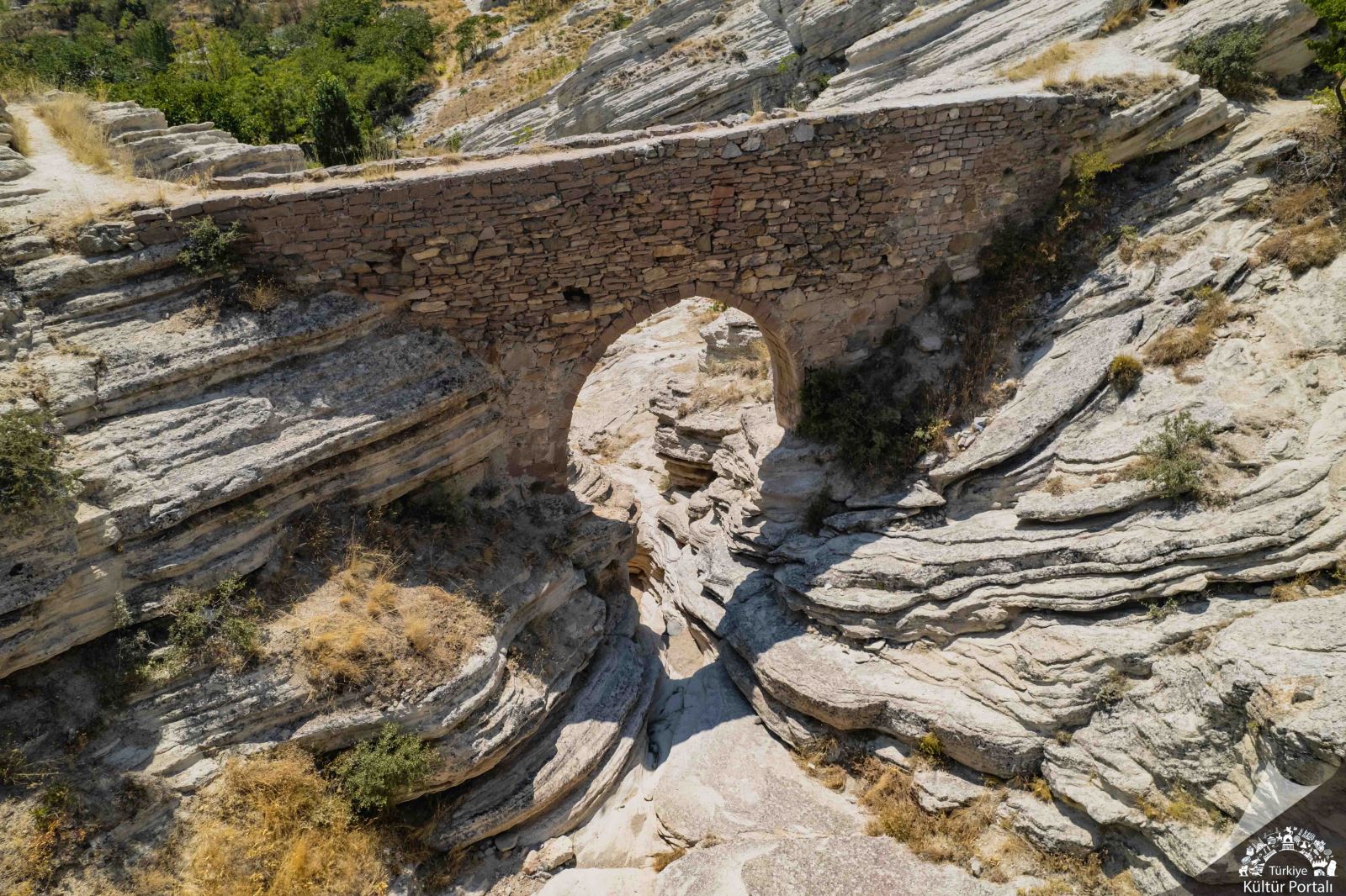 Dar ve yüksek kemerli tasarımıyla dikkat çeken bu taş köprü, iki dik yamacı birbirine bağlamaktadır ve altından derin bir vadi geçmektedir. Yakın çevresinde eski su yolları ve künklere rastlanmıştır. Bu nedenle bir su kemeri olduğu ve Bizanslılar döneminde yerleşimin su ihtiyacını gidermek için kullanıldığı düşünülmektedir. Aynı zamanda ulaşımı kolaylaştıran bir köprü görevi de görmüştür.