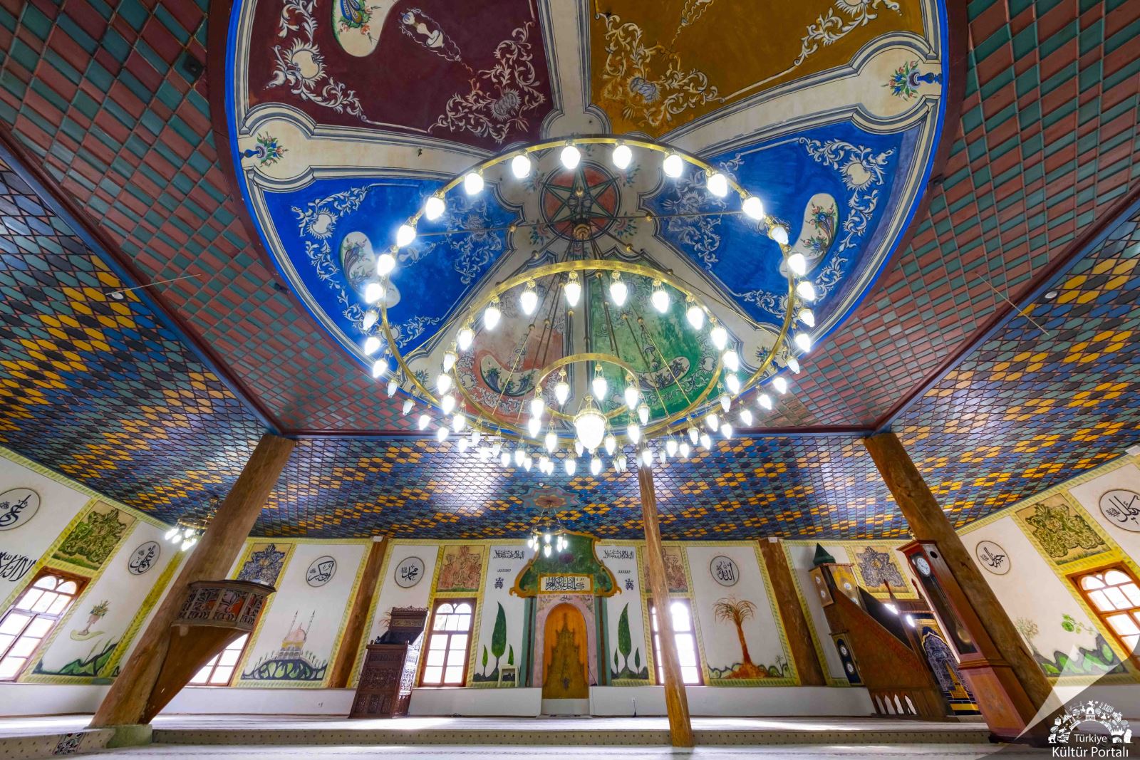 Caminin kubbesi de oldukça süslüdür. Çıtalarla düzenlenen ahşap tavandaki geometrik yüzeylerin içleri farklı renklere boyanarak tavana hareketlilik kazandırılmıştır. Sarı, siyah, mavi ve kiremit kırmızısı renklerin yoğun olarak kullanıldığı tavanda, yıldız ve kare şeklinde motiflerden oluşan süslemeler tüm yüzeye yayılmıştır. Özellikle mihrap önündeki alanda iç içe geçmiş sekiz kollu yıldız motifinden oluşan göbek dikkat çekicidir.