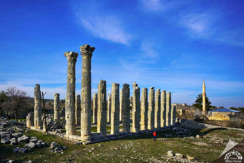 Tören kapısından sonra antik çeşmeyi geçince Sütunlu Cadde’nin solunda bir avlu içerisindeki Zeus Tapınağı’na ulaşılır. I. Seleukos Nikator tarafından yaptırılmış olduğu düşünülen Zeus Tapınağı, Anadolu’da dört bir yanı korinth tarzında, tek sıra 36 sütunla çevrili, peripteros planlı, en eski tapınaklarından biri olarak sanat tarihinde önemli bir yere sahiptir. Romalılar tarafından da kullanılan tapınak, Hıristiyanlık döneminde, 5. yüzyılda yapılan değişikliklerle kiliseye çevrilmiştir. Cellası yıkılıp sütun araları örülmüş, buralara kapılar konulmuş ve doğusundaki sütunlar kaldırılarak yerlerine apsis eklenmiştir.