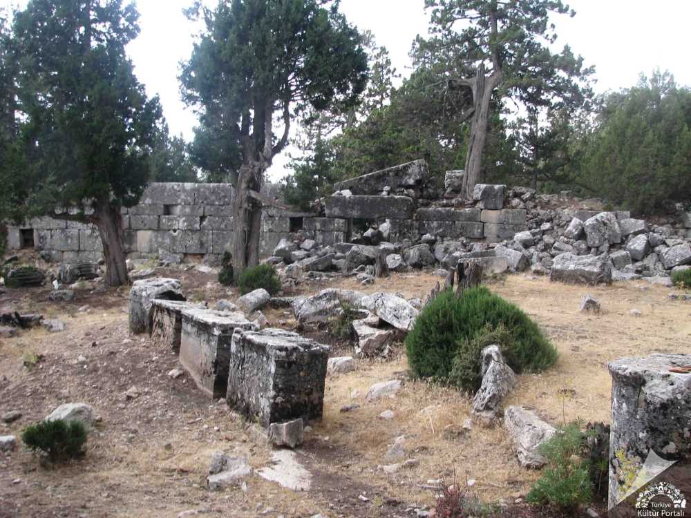 Antik kentten günümüze ulaşan en erken kalıntı kentin güneyinde yer alan ve MÖ 200’lü yıllara tarihlenen sur duvarlarıdır. Sur duvarı son derece güzel taş işçiliği ve beşken kulesi ile dikkat çekicidir. Roma Dönemi'nde şehre yukarı agorayı tepeden görecek konumda inşa edilen ve muhtemelen Augustos Dönemi'ne ait dorik bir tapınak inşa edilmiştir. Bu yapının içinde imparator Augustos için yazılmış bir yazıt parçası ele geçmiştir. MS 70 yıllarından itibaren Flavius Dönemi'nde yukarı agoraya çıkan yolun güneyine şehirdeki iki gymnasiume, hamam kompleksinin küçük alanı inşa edilmiştir. Büyük gymnasium- hamam kompleksi ise MS 140’larda kısmen Rhodiapolis’li Opramoas tarafından bağışlanan paralar ile yukarı agoranın batısına yapılmıştır. Yapıya daha sonra III. yüzyıl başlarında sütunlu bir avlu eklenmiş ve yapı imparator Septimus Severus ile Caracalla’ya adanmıştır. Şehrin güneyindeki su kemeri de olasılıkla Flaviuslar Dönemi'nde yapılmıştır.
