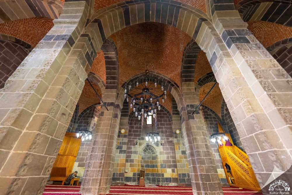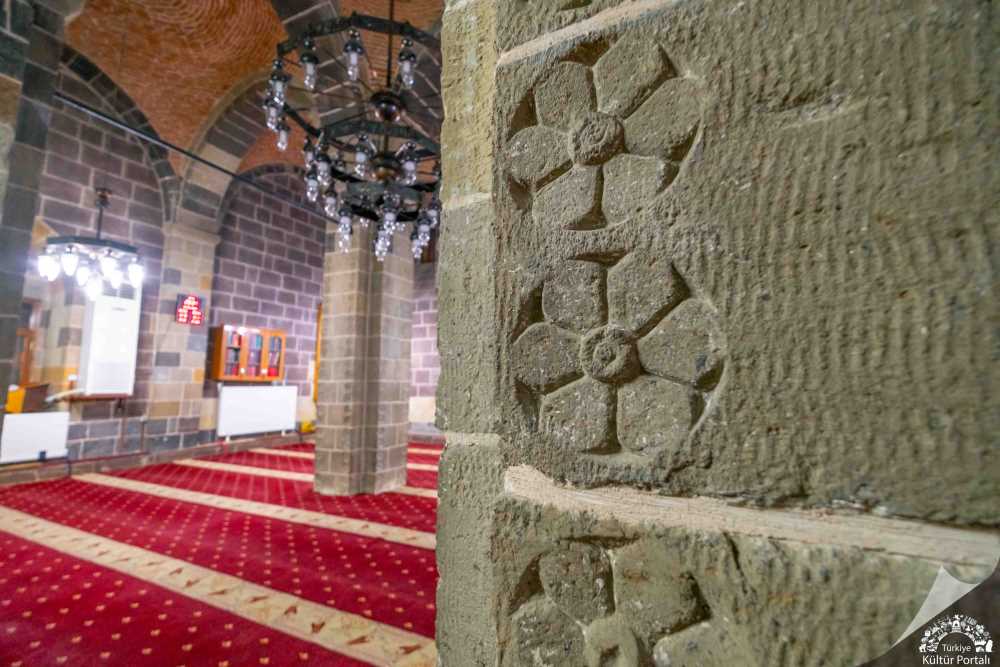 Caminin içi ortada yer alan dört haçvari ayak ve karşılarında, duvardan taşıntılı plastırlar üzerine yaslanan sivri kemerlerle dokuz bölüme ayrılmaktadır. Üst örtüyü taşıyan haçvari ayakların, dış yüzlerinin iki yanları altı kollu papatya şeklindeki kazıma çiçeklerle zeminden kemerlerin üzengi noktalarına kadar süslenmiştir.