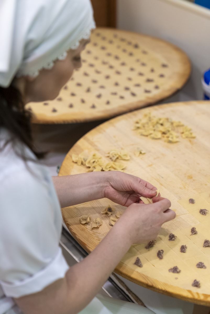 Dinlendirilen hamur, ikiye bölünür. Hamur bezeleri, yapışmamaları için unlanarak 1 - 2 mm kalınlıkta açılır. Açılan yufkalar, 4 - 5 cm ölçülerinde kareler halinde kesilir. Kesme işlemi hamur parçalarının kurumaması için hızlı bir şekilde yapılmalıdır. Kare şeklindeki hamurların üzerlerine silme 1 çay kaşığı iç harç konur ve kareler, üçgen şeklinde katlanarak üçgenin alt iki köşesi birleştirilir. Birleştirilen köşelerin dışında kalan köşe yukarı doğru kaldırılarak hamura kulak şekli verilir.