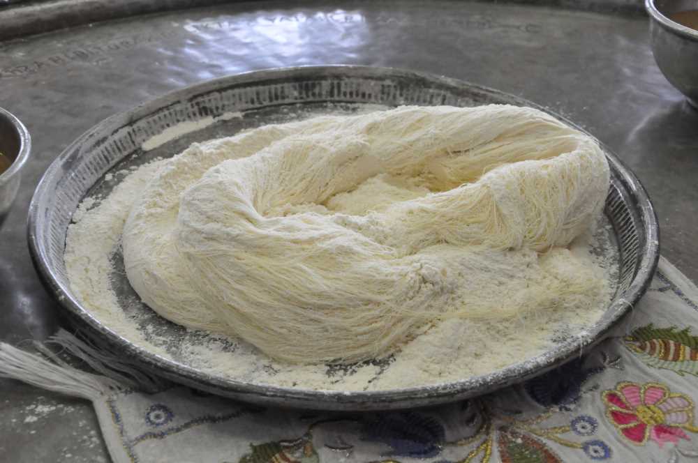 Un tereyağında pembeleşinceye kadar karıştırılarak kavrulur. Topakları ezilir, elenir ve bir tarafa bırakılır. Diğer taraftan şeker ve su içine bir parça limon tuzu eklenip kaynatılarak koyu bir macun kıvamına getirilir. Soğuk suya damlatılan macun katılaşıyorsa miyane olmuş demektir. Her tarafı yağlanmış genişçe bir siniye boşaltılarak tatlının soğuması beklenir. Soğuyup ele alınacak kıvama gelince eller iyice yıkanarak bir sininin etrafında dizilen kişiler tarafından inceltip uzatarak simit şekli aldırılır. Halka ara ara un serpilerek büyütülür. Siniye sığmaz hale gelince sekiz yapılır katlanır ve tekrar halka haline getirilir. Bu işlem un ilave edilerek 15-20 kez tekrarlanır. İyice incelip rengi kahverengiden beyaza döndüğünde hazır olmuş demektir. Unları silkelenir biraz soğuması için bekletilir ve servis edilir.