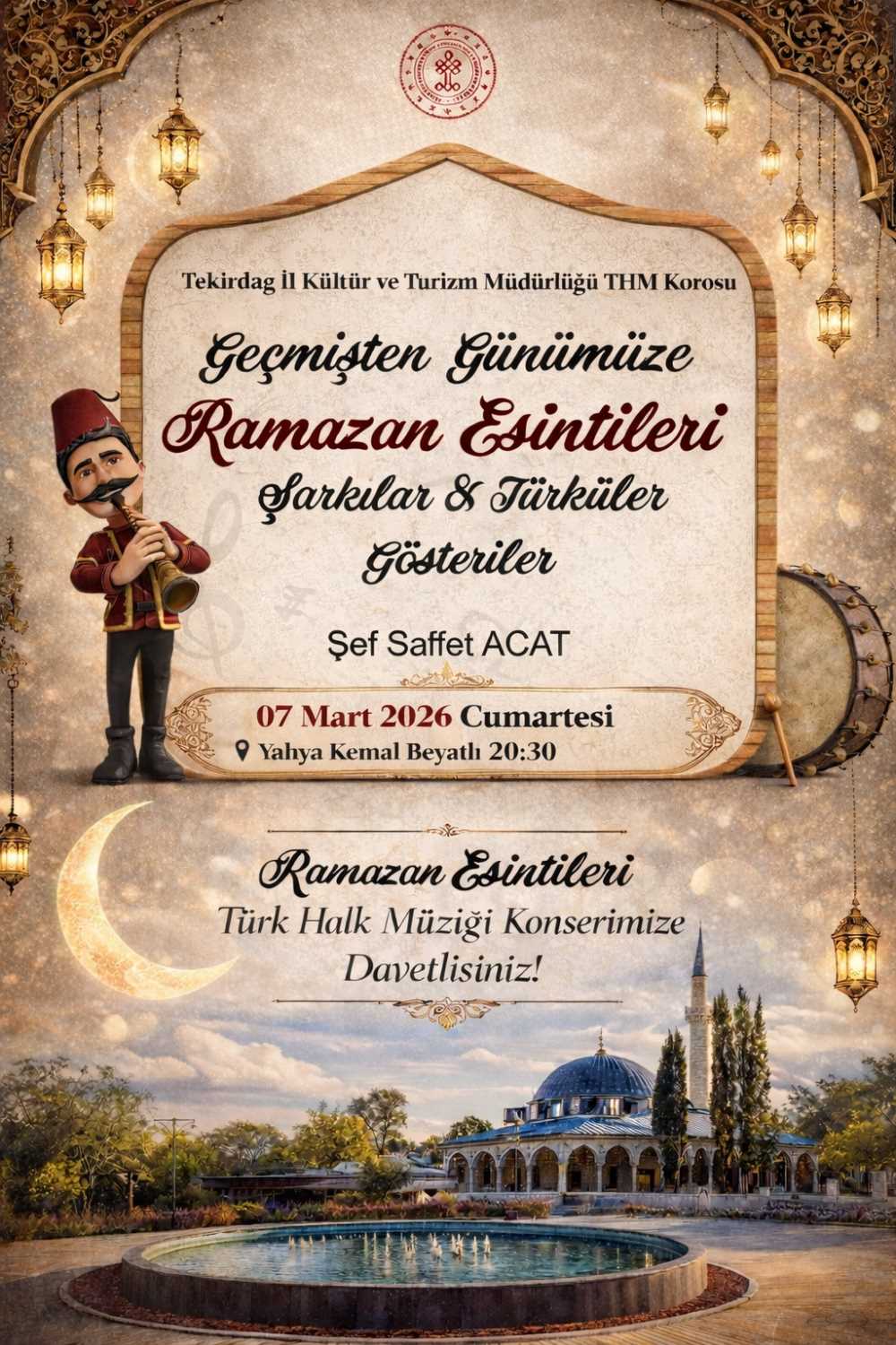 Tekirdağ İl Kültür ve Turizm Müdürlüğü THM Korosu tarafından düzenlenen “Geçmişten Günümüze Ramazan Esintileri” adlı Türk Halk Müziği konseri, Ramazan ayının manevi atmosferini geçmişten günümüze uzanan ezgilerle yaşatmayı amaçlamaktadır. Şarkılar, türküler ve çeşitli gösterilerle zenginleştirilen program, dinleyicilere nostaljik ve duygu dolu bir akşam sunacaktır.