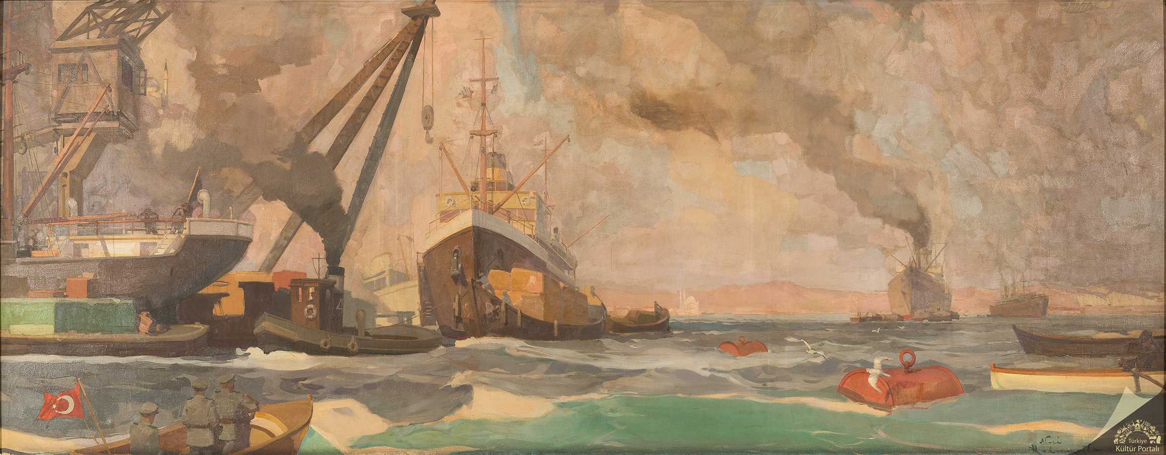 Naci Kalmukoğlu’nun sanatının üslup özelliklerini yansıtan iki ayrı resim (Liman, Köyde Türün İşleyenler), farklı konularına karşın aynı temayı yansıtmaktadır. Bu iki resim tarım ve sanayide kalkınan ve gelişen Türkiye’yi sembolize etmektedir. Büyük boyutlarıyla dikkati çeken bu resimler, bakanlıkların koridor ve makam odaları için sanatçılara resimler ısmarlandığını kanıtlamaktadır. “Köyde Tütün İşleyenler”, kırsal kesim insanının mutlu ve üretken hayatını betimlemektedir. Liman, fabrika bacaları, buharlı gemiler ve vinçlerle sanayileşen liman kentlerinin zengin geleceğini vurgulamaktadır.“Mehazinden Müzeye” sergisi, Maliye Bakanlığımızın hazine değerinde olan sanat koleksiyonunun Ankara Resim ve Heykel Müzesine verilmesidir. Maliye Bakanlığı Ankara Resim ve Heykel Müzesi’nin; kültürel değerleri yaşatmak, geliştirmek, yaymak, tanıtmak, değerlendirmek ve benimsetmek, tarihî ve kültürel varlıkların tahribini ve yok edilmesini önlemek hedefine ve yeniden yapılandırma çalışmalarının sonuçlarına güvendiğini belirleyen bu girişimi çok önemlidir. Uygun koruma ve sergileme koşullarına haiz olmayan odalardan alınarak Kültür ve Turizm Bakanlığı Güzel Sanatlar Genel Müdürlüğü Ankara Resim ve Heykel Müzesine kayıtlarla teslim edilen resimler, sanat koleksiyonlarını koruma bilinci uyandıracak ve resim sanatımızın tarihinin araştırılarına yeni kaynakları sunmaktadır.