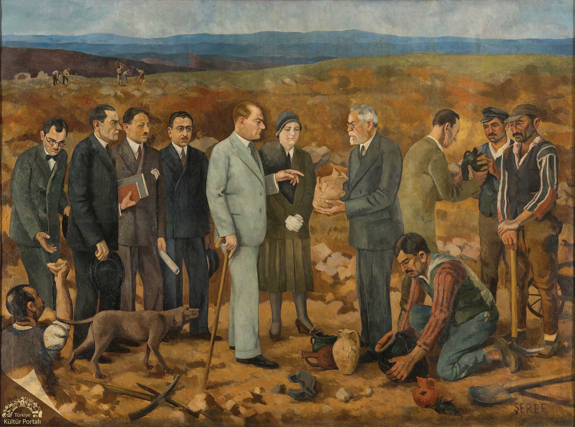Şeref Akdik’in eseri olan, "Atatürk Ahlatlıbel’de Kazıda”, adlı resim, Türkiye Cumhuriyeti’nin ilk kazısı olarak arkeolojik kazılarının başladığını belgelemektedir. Ahlatlıbel kazısı, Ankara’nın 14 km. güneybatısında, Eskişehir yolu üzerindeki, Yalıncak köyü yakınında, Orta Doğu Teknik Üniversitesi’nin sınırları içinde yer alan Ahlatlıbel, bünyesinde barındırdığı arkeolojik değerlerin yanı sıra, Cumhuriyet tarihinin ilk Türk kazısı olması bakımından da büyük önem taşıyan arkeolojik kazıdır. Şeref Akdik’in eseri, 1933 yılında Müzeler Genel Müdürü Dr. Hamit Zübeyr Koşay tarafından gerçekleştirilen kazıya 5 Mayıs 1933 tarihinde yapılan ziyareti resimlemektedir. Mustafa Kemal Atatürk, arkasında, Milli Eğitim Bakanı Dr. Reşit Galip ve Ankara Valisi, uzmanlarla; A.Ü. Dil ve Tarih Coğrafya Fakültesi Tarih Bölümü Başkanı Prof. Dr. Afet İnan, Arkeoloji Bölümünden Prof. Dr. Remzi Oğuz Arık ile birlikte Ahlatlıbel kazısındadır. Dr. Hamit Zübeyr Koşay, buluntuları Atatürk’e takdim etmek üzere, kazı ekibi olan köylülerin elinden seramik kabı itinayla almaktadır. “Mehazinden Müzeye” sergisi, Maliye Bakanlığımızın hazine değerinde olan sanat koleksiyonunun Ankara Resim ve Heykel Müzesine verilmesidir. Maliye Bakanlığı Ankara Resim ve Heykel Müzesi’nin; kültürel değerleri yaşatmak, geliştirmek, yaymak, tanıtmak, değerlendirmek ve benimsetmek, tarihî ve kültürel varlıkların tahribini ve yok edilmesini önlemek hedefine ve yeniden yapılandırma çalışmalarının sonuçlarına güvendiğini belirleyen bu girişimi çok önemlidir. Uygun koruma ve sergileme koşullarına haiz olmayan odalardan alınarak Kültür ve Turizm Bakanlığı Güzel Sanatlar Genel Müdürlüğü Ankara Resim ve Heykel Müzesine kayıtlarla teslim edilen resimler, sanat koleksiyonlarını koruma bilinci uyandıracak ve resim sanatımızın tarihinin araştırılarına yeni kaynakları sunmaktadır.
