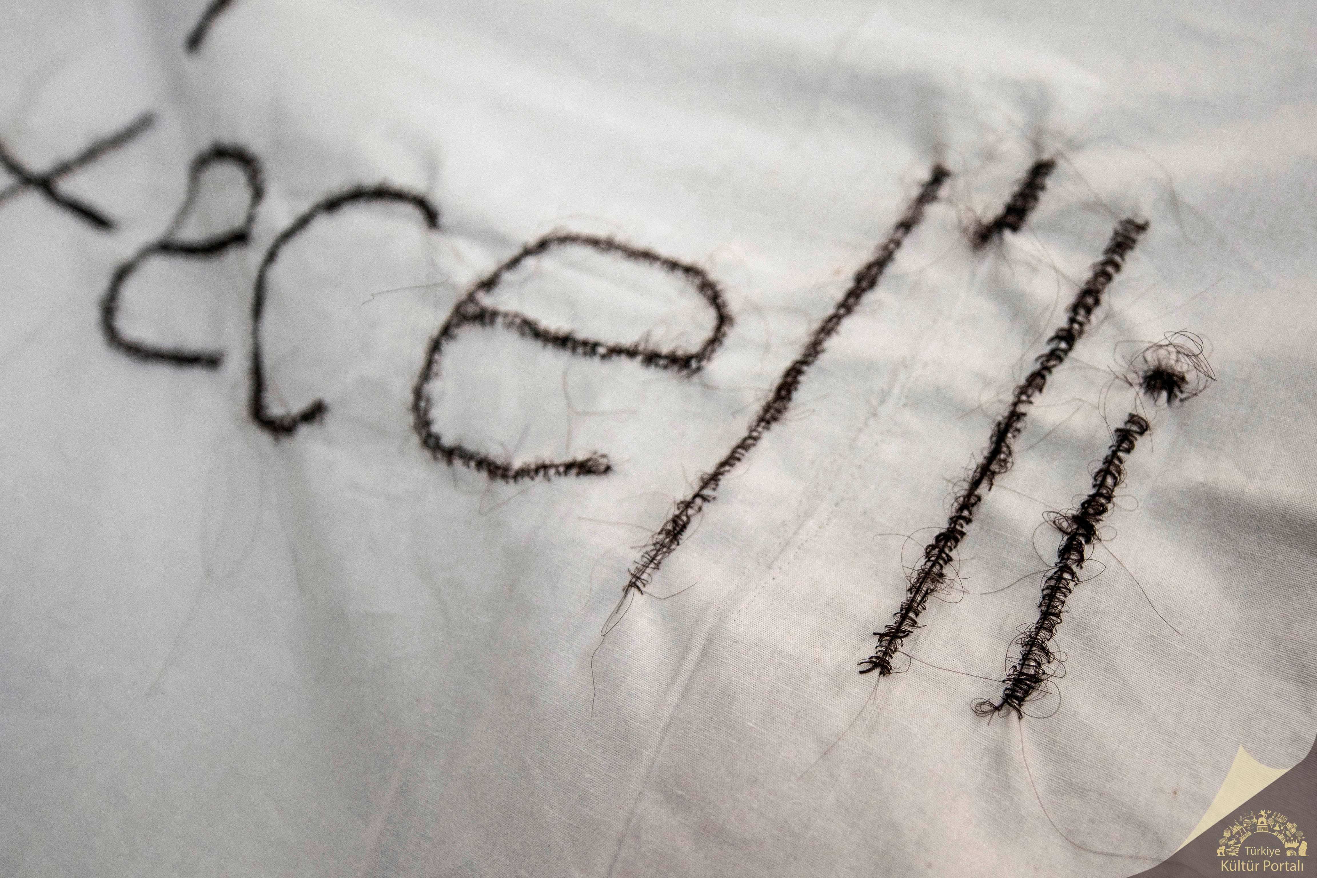 Ebru UĞUR (İzmir, 1988)Dokuz Eylül Üniversitesi / Güzel Sanatlar EnstitüsüDokuz Eylül University / Institute of Fine ArtsT’ECEL’Lİ / MANIFESTATIONYerleştirme, Karışık Teknik / Pamuklu Kumaş, Saç, Plastik SopaPlacement, Mixed Technique / Cotton Fabric, Hair, Plastic Stick80x44x12 cm, 2018Saç, bedenin ölümsüzlüğe yazgılı payı. Bazı durumlarda da, hayat ve ölüm arasında yaşama karşılık verilen bir diyet. Çatışmalarda ateşkes için kullanılan beyaz bayrak; tecelli ile ecel arasındaki düalitede de, hem kefeni hem de özgürlük alanını, ateşkesi, tarafsız bir bölgeyi simgeliyor.Hair is the part of the body that’s desting is the immortality. In some cases, a diet is given between life and death for living. The white flag, used for ceasefire in the conflicts, the duality between transfigüration and death, the white flag symbolizes both shroud and freedom field, ceasefire, neutral zone.