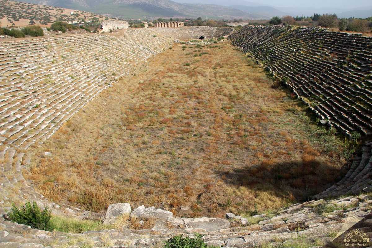 Dünyanın en önemli antik yapıları arasında gösterilen, ören yerinin en iyi korunmuş görkemli yapıtlarından birisi de kentin kuzeyinde yer alan stadyum. 270 m uzunluk ve 30.000 izleyici alabilecek kapasiteye sahip. Elips plan şeklinde yapılışı, tüm seyircilerin etkinlikleri rahat izlediğinin göstergesi.