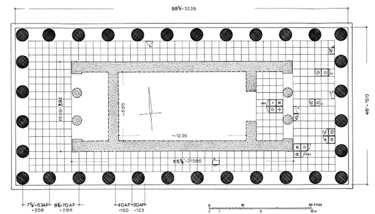 36x16 m. boyutlarındaki tapınak, Dor düzenindeki sütunlarla çevrilmiş ve karelere bölünmüş bir tavanla kapatılmıştır. Tapınak kirişleri dış yüzündeki metop kabartmalarla süslenmiştir. Bu metoplardan en ünlüsü, bugün Berlin’de olan Apollon-Helios betimli metoptur. Yapı, Roma döneminde İmparator Augustus’un (M.Ö. 31-M.S 14) emriyle yenilenmiştir.