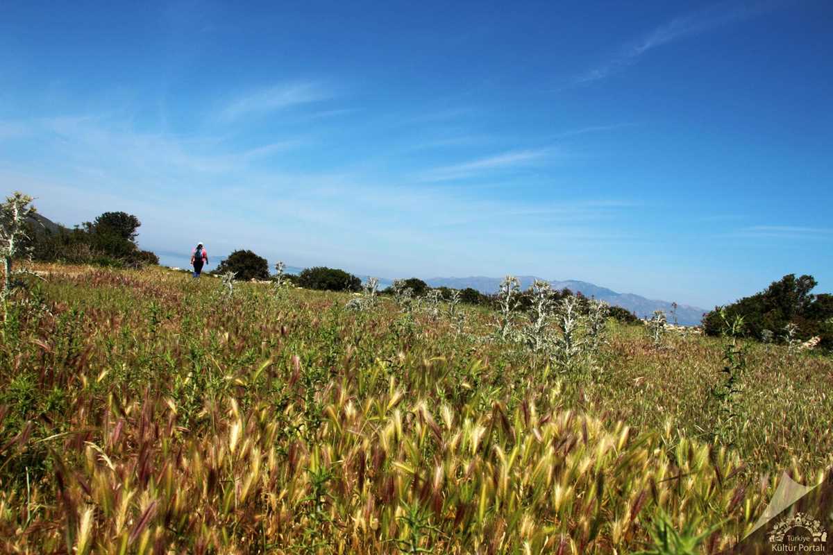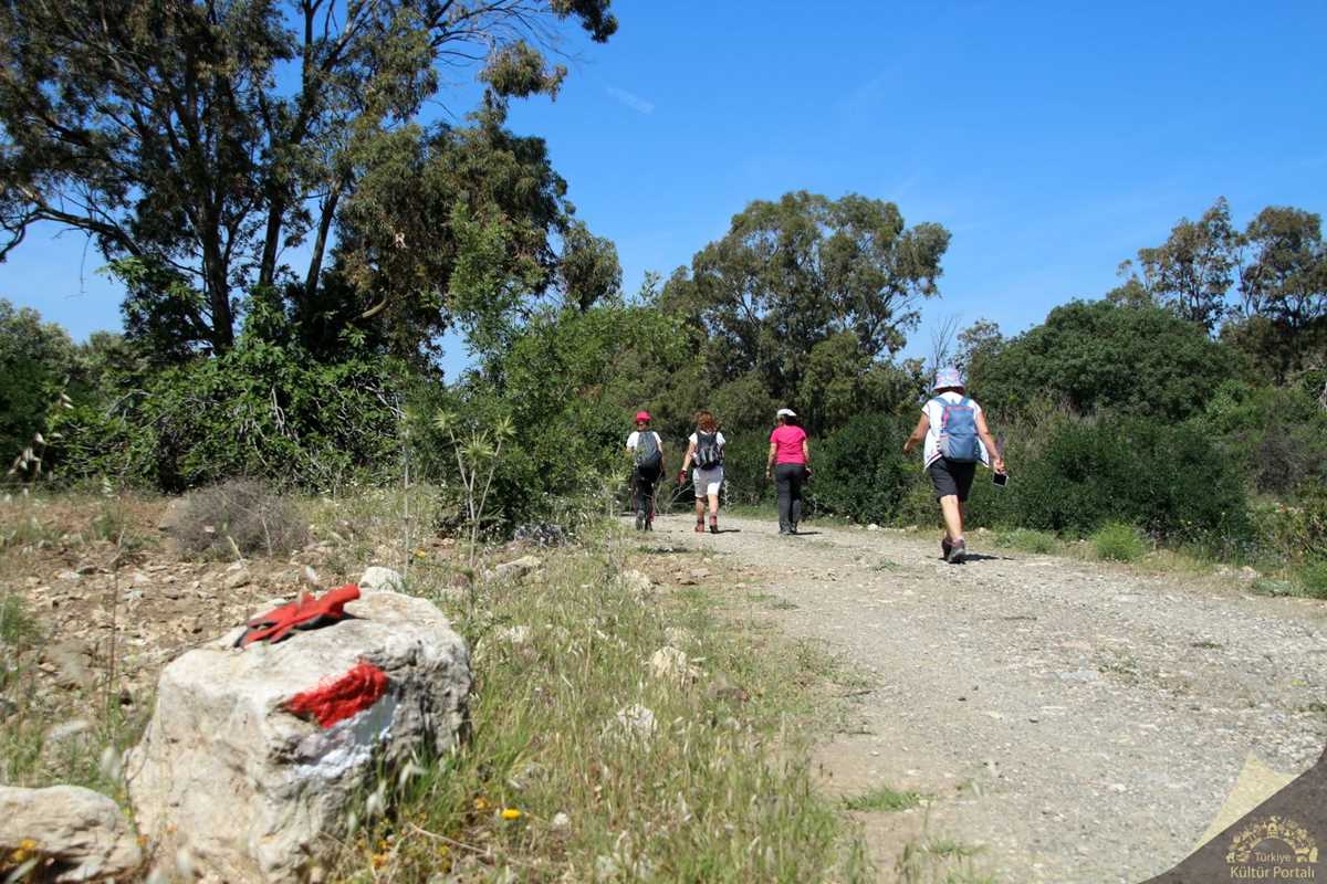 Rotamızın başlangıç noktası toprak köy yolu. Tarlalarda ağırlıklı olarak sarı, beyaz papatyaların yanı sıra, aralarına serpiştirilmiş gibi gelincik ve farklı çiçek türleriyle manzara harika görünüyor. Köy bahçelerinin, tarlaların arasından ilerliyoruz. Ara ara yol boyunca badem ve zeytin ağaçlarının bulunduğu alanlardan yürüyüşümüze devam ediyoruz. Kırmızı-beyaz işaretlemeler mükemmel. Bazı yerlerde neredeyse beş metrelik mesafede bile işaretleme yapılmış.