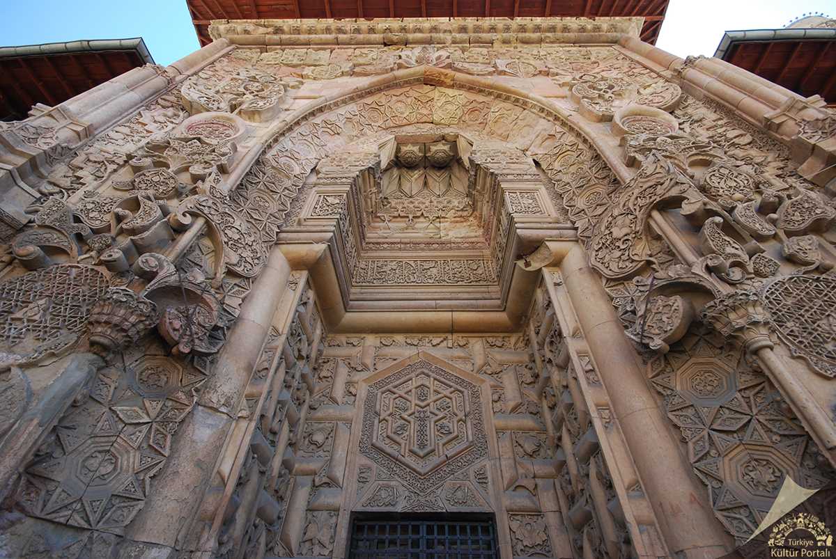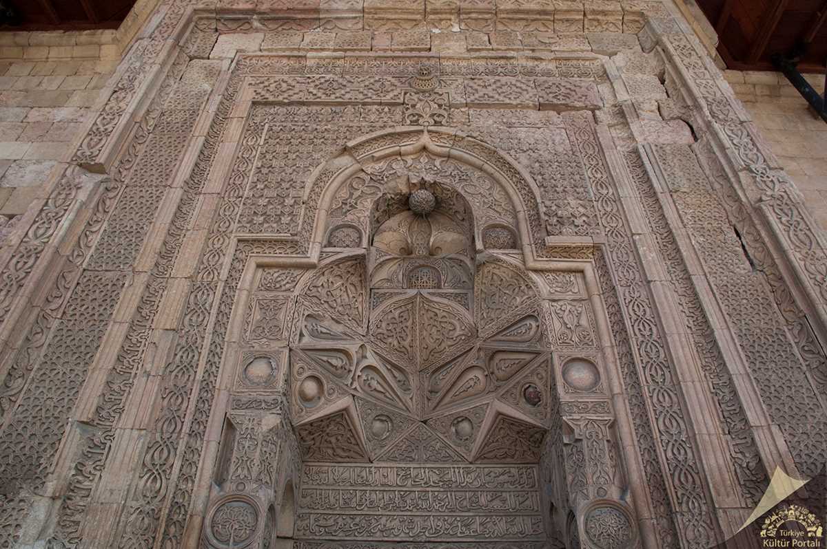Yapının tüm taç kapılarındaki üç boyutlu, asimetrik, bitkisel ve geometrik figürler özgün bir betimleme anlayışıyla heykele yakın yüksek kabartma tekniğinde coşkun bir biçimde işlenmiştir.