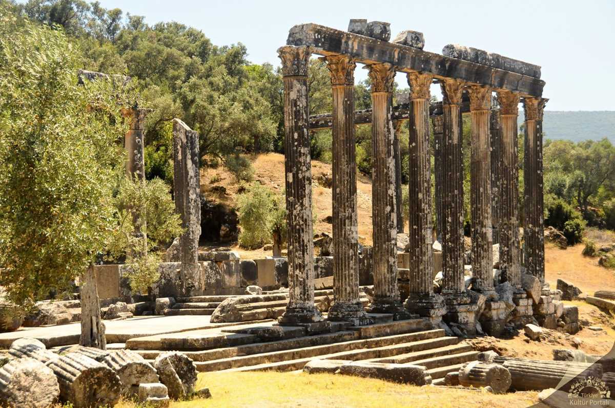 Bir tepe üzerine kurulmuş olan ve şehrin önemli dinsel yapısı olarak görülen Zeus Tapınağı dünyanın en iyi korunmuş Zeus Tapınaklarından biridir. Etrafındaki sütunla çevrili mekânın üstünün mermer kirişlerle kaplı olması nedeniyle Zeus Tapınağı pseudodipteros plandaki tek örnektir.