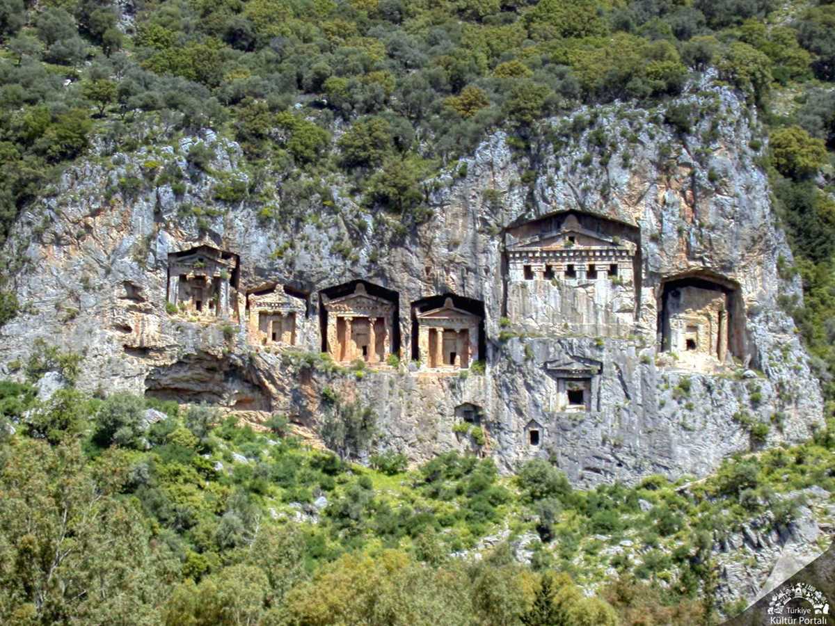 Kuzey koyu kuzey yönden kuşatan Balıklar Dağı’nın koya bakan kalker sarp cephesi üzerinde farklı kodlarda açılan kaya mezarları, güneybatıya doğru yedi farklı alanda gruplanmaktadır. Sert kayalara büyük güçlüklerle oyulan mezar odalarında, bir veya birden fazla mezar yeri ve sunaklar bulunmaktadır. Birden fazla mezar bulunan Kral Mezarlarına kralın dışında ailesinin de defnedildiği tahmin edilmektedir.