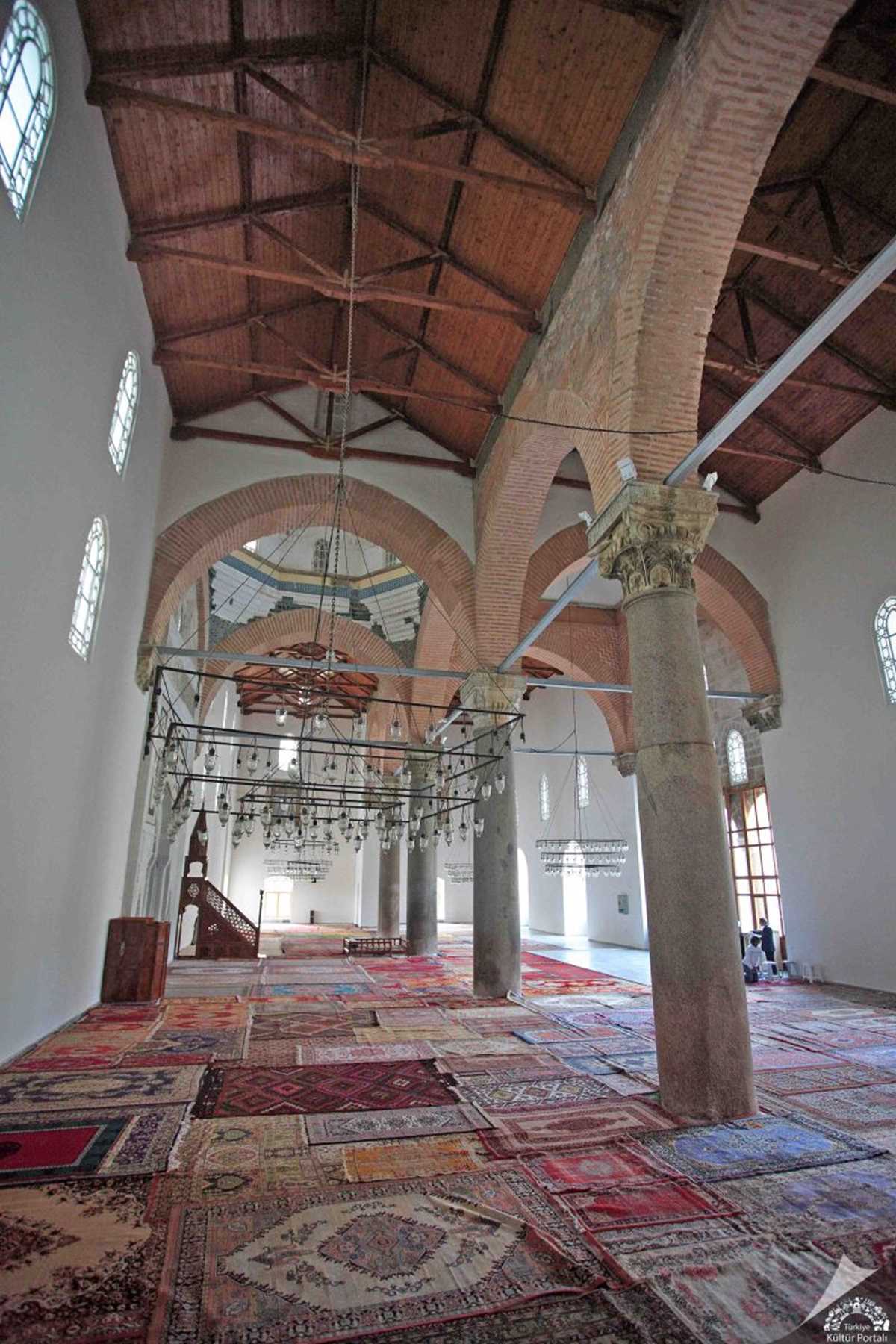 Bir dönem kervansaray olarak kullanılan yapının kemerlerinin sütunlara birleştiği yerlere ayetler yazılmıştır. Caminin sütunları