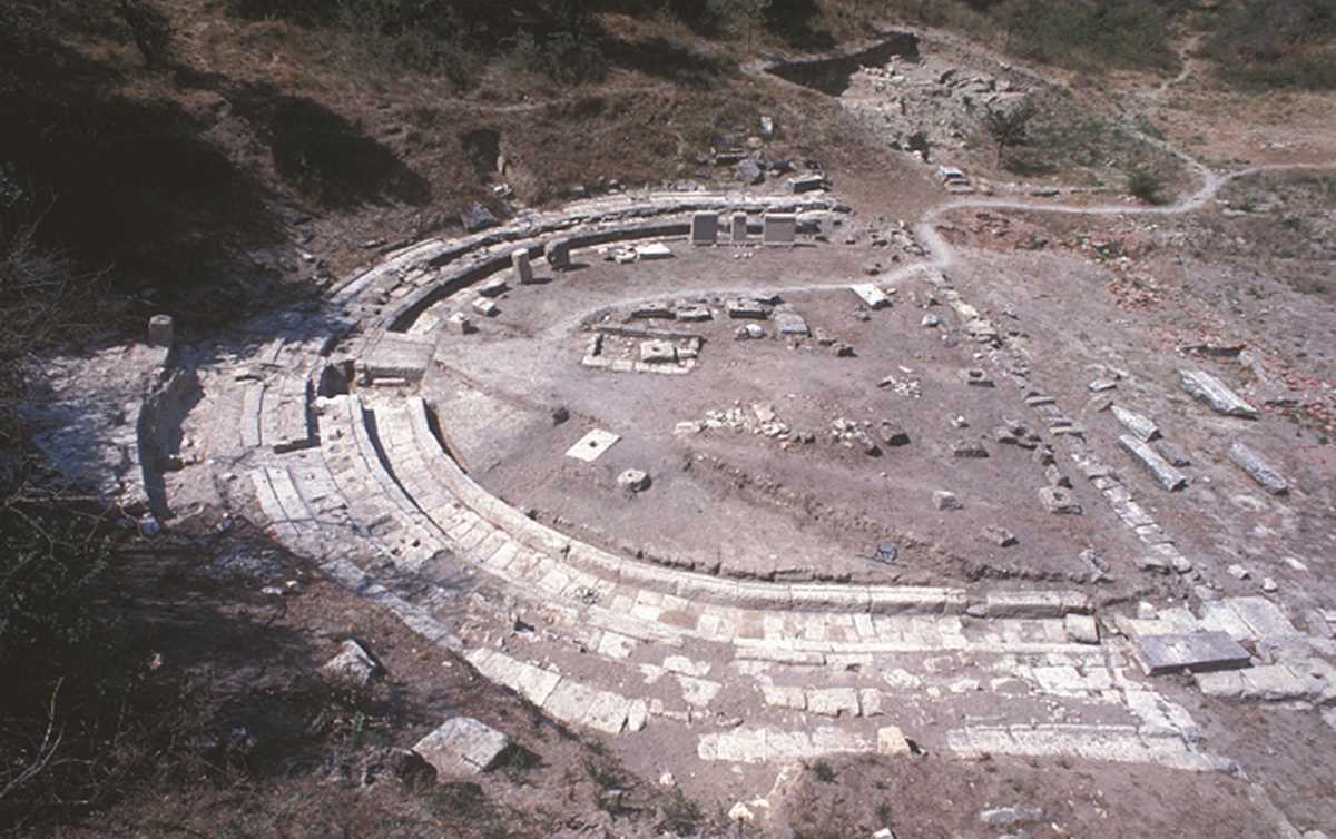 Bastiyonun arka tarafında, doğu yönünde görülen arazideki çukurlukta, büyük tiyatro yer almaktadır. 6000 kişilik seyirci kapasitesi olan bu tiyatro, zengin heykelleri ile tanınmaktaydı. M.Ö. 4. yüzyılın sonlarında inşa edilmiş, M.Ö. 85’te Fimbria tarafından yıkılmış ve daha sonra İmparator Augustus (M.Ö. 31-M.S. 14) tarafından tamir ettirilmiştir. Sadece bazı bölümleri kazılmıştır.