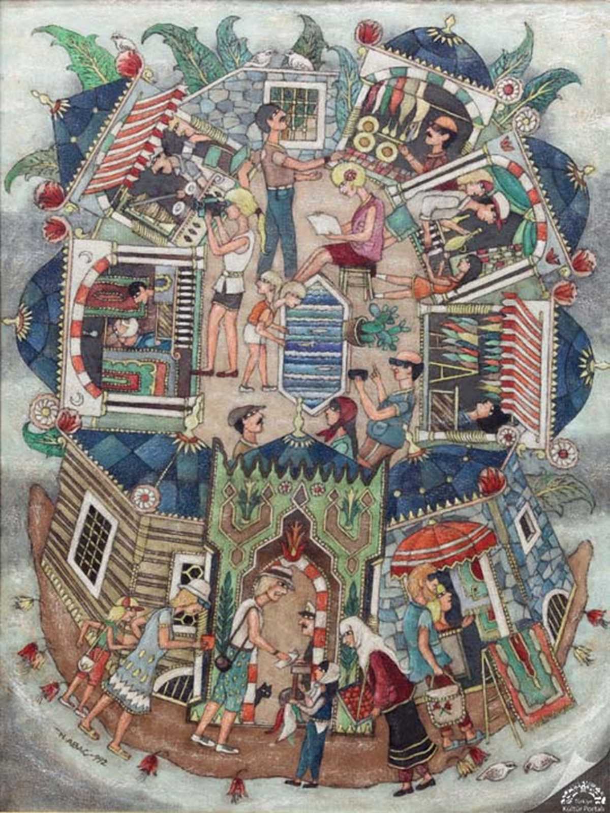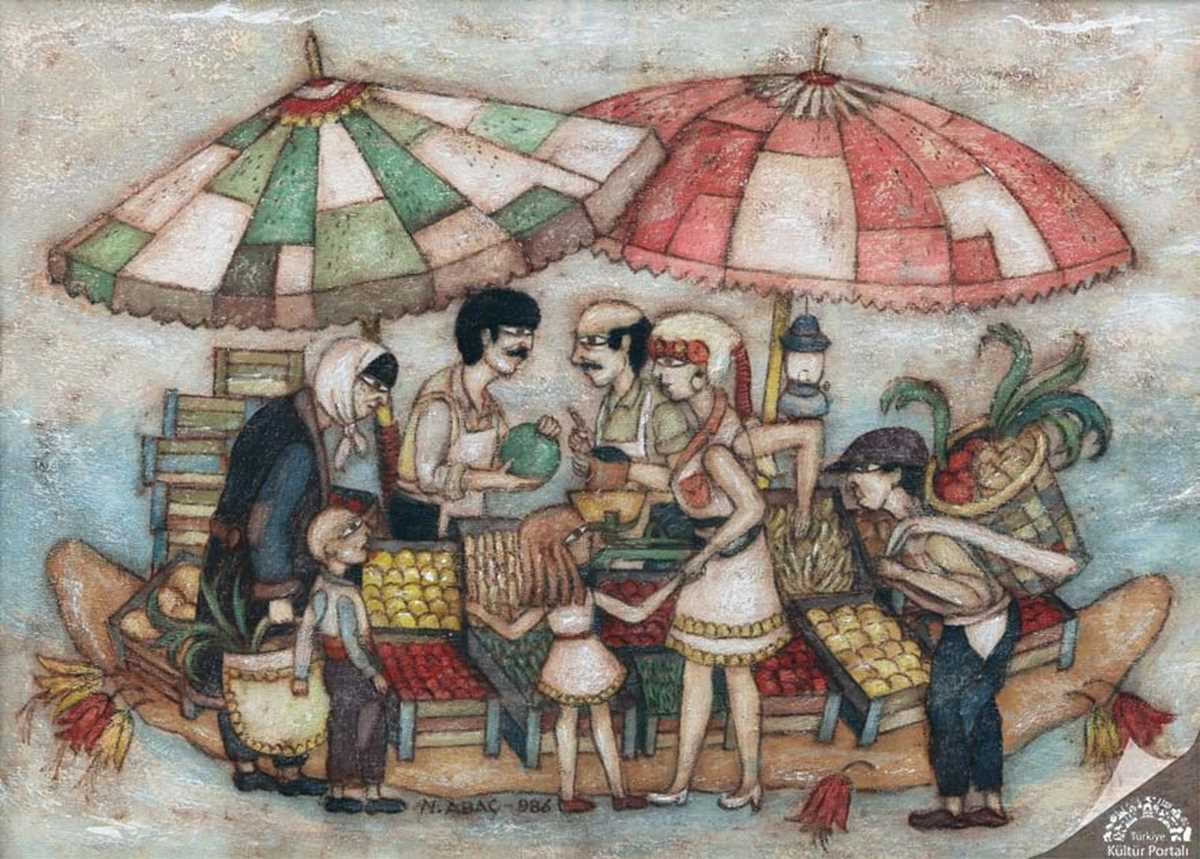 Folklorik değerleri fantastik bir dünyanın imgeleriyle birleştiren sanatçının Motor Sefası (1979), Telli Gelin Oyunu, Köyde 23 Nisan, Kır Kahvesi (1978), Pazar Yeri (1978), Pazar Yeri (1986), Köydeki Alman Gelin, Kervansaray II (1992) adlı yapıtlarında ana tema, halk kültürü ve geleneksel yaşamdır.