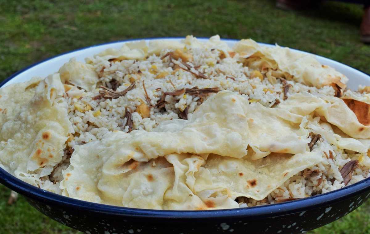 Ev işi yufka veya ince lavaş ılık suda ıslatılır ve sofra bezine sarılarak servise kadar yumuşak kalması sağlanır. Demlenen pilav, bir tepsiye aktarılır, üstüne yufkalar veya ince lavaş serilerek servis edilir.