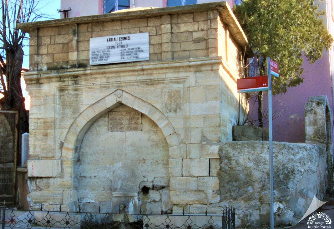 Kadı Ali Çeşmesi 1568 - 69 yılları arasında Köse Mihalzade Ali bin Hızır Bey tarafından inşa ettirilmiştir. Dikdörtgen plan şemasıyla kesme küfeki taştan tek cepheli bir köşe çeşmesi olarak yapılmıştır.