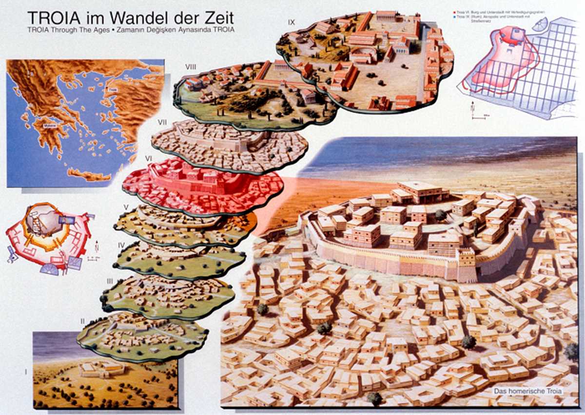 Troyalılar, yıkılan Troya'nın üzerine VII. Troya'yı kurarak yaşamaya devam etmişlerdir. Ünlü Troya Savaşı'nı yaşamış olan bu kent M.Ö. 1250-1040 yıllarına tarihlenir. Kentin sokaklarında ok, mızrak gibi silahların bulunması ve kalın bir kül tabakasının oluşu destanın arkeolojik delillerle de ispatlanmasını sağlamıştır. Bu katlarda bol Miken kaplarının bulunuşu, bilim insanlarını da, savaşın geçtiği katın bu olduğu sonucuna götürmüştür. Bu tabakanın VII a evresi MÖ, 1150'ye kadar devam eder. VII a tabakasından sonra Troya'da VII b tabakası görülür. Bu tabakanın VIIb1, VIIb2 ve VIIb3 olmak üzere M.Ö 1150-950'ye kadar devam ettiği ve bir yangınla son bulduğu bilinir. Troya’da M.Ö. 950'den M.Ö. 700'lere kadar sönük bir yaşantının olduğu izlenir. Bu dönemin insanları eski Troya'dan kalmış malzeme ve evleri kullanmışlardır. Ardından gelen M.Ö. 700-85 dönemi VIII. Troya, M.Ö. 85-M.S. 500 yılları yaşayan şehir ise IX. Troya olarak adlandırılır ki bu tabaka Roma Dönemi Troyası'dır. Troya X’da ise M.S. 13. yüzyılda başlayan Bizans yerleşmesi M.S. 14. yüzyılın ortalarına kadar sürmüştür. Bu tarihten sonra da o dönemdeki büyük politik değişiklikler nedeniyle Troia, kültür hayatındaki eski önemini kaybetmiştir. M.S. 17. yüzyıldan itibaren ise özellikle Avrupalı aydınların artan Troya ilgisi, Heinrich Schliemann’la doruk noktasına ulaşmış ve bu önem günümüze kadar devam etmiştir.