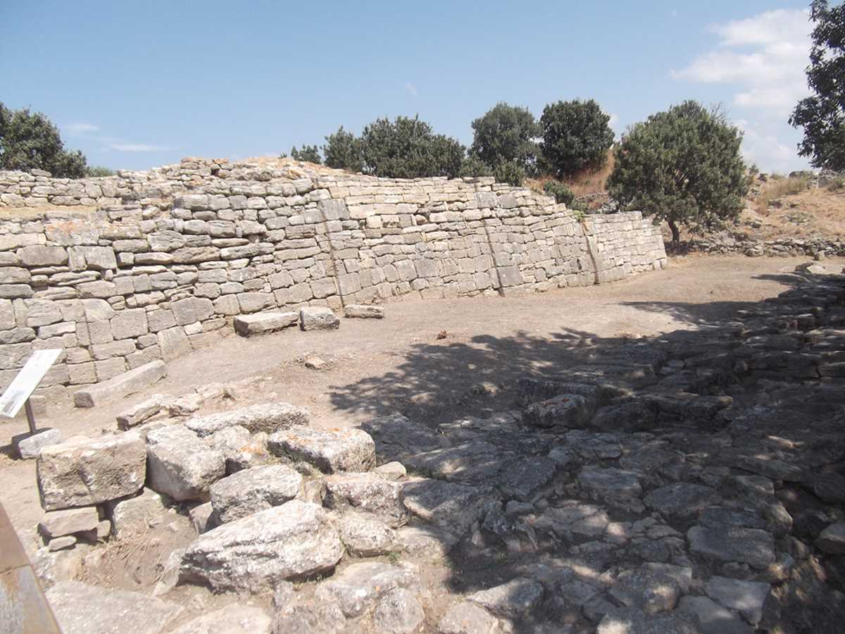 Şu anda Troya VI kalesinin en güneyinde, savunma duvarının hemen üstünde durmaktasınız. Sadece yüzeyde açığa çıkarılmış bu duvarı, doğu duvarında olduğu gibi bugünkü sınırdan 5 m. daha güneyde düşünmek lazım.