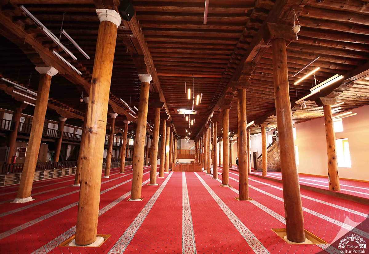 Dört giriş kapısı bulunan ve çatısını 67 adet ahşap direğin taşıdığı camide, direkler üzerinde Bizans Dönemine ait başlıklar da kullanılmıştır. Direkler ardıç ve sarıçam ağacından yapılmıştır. Caminin ortasında yukarıdan ışık sağlaması için aydınlık feneri olarak tabir edilen bir boşluk bulunmaktadır.