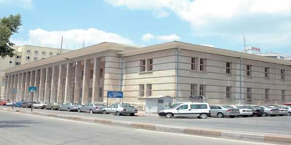 Ulusal bir mimari proje yarışması sonucunda uygulanmıştır.(1945'te proje yarışması Bayındırlık Bak.)Daha Önce buğday pazarı olarak kullanılan arsaya inşa edilen yapının önce ön,güney bölümü tamamlanarak hizmete girmiş,ardından iki blok tamamlanmış ve yapı U formunu kazanmıştır.Artan mekan ihtiyacını karşılamayan yapının kuzey kısmına 1978'de 1 blok daha eklenmiş ve yapı iç avlulu hale dönüştürülmüştür.Yapının,tüm cephe boyunca uzanan basamaklarla ulaşılan ve çatıya kadar yükselen 18 adet kesme taş kolondan oluşan kolonatın gerisine yerleştirilmiş olan girişin yer aldığı ön cephesi görkemli bir izlenim oluşturmaktadır.Ana giriş kapısı 3 bölmelidir ve üzerinde kapısı açılmayan balkon yer alır.Bunun dışında yapının 2 girişi daha vardır.Tüm cephelerde,bodrum kat-su basma seviyesinden itibaren 3 sıra kesme taş ve 2 sıra tuğla malzemeden oluşturulan farklı 2 doku-renk halinde yatay kuşakla tekrarlanarak izlenmektedir.Yapı gizlenmiş az eğimli bir çatıyla örtülüdür.Zemin katta yer alan ağır ceza salonu dairesel yerleşimiyle oldukça nitelikli bir iç mekan düzenlemesi sergiler.Yapı 1992 yılında korunması gerekli kültür varlığı olarak tescillenmiştir.