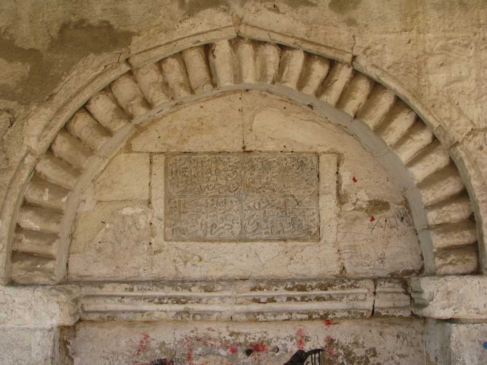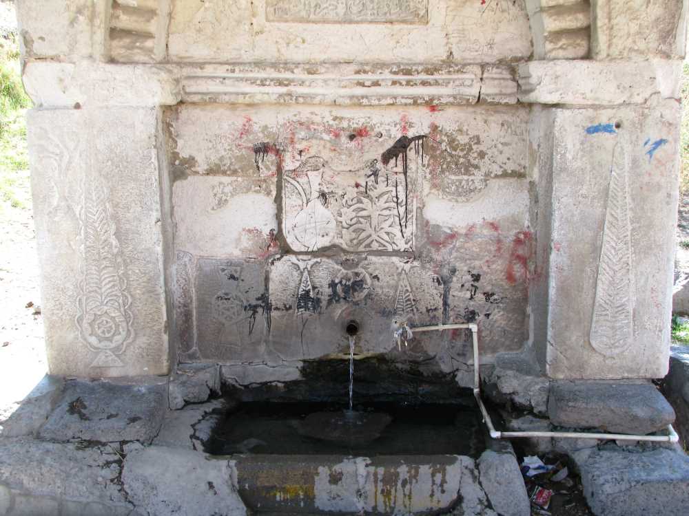 Kemer içinde yazıt, nişin alt bölümlerinde ve ayakların dışa bakan yüzlerinde kabartmalı ve kabartmasız mermer kütleler konmuştur. Ayrıca kemer ve ayaklar arasında az çıkıntılı iki yatay yivli iki parçalı mermer yatay kütle konmuştur. Ayaklarda değişik iki selvi vardır. Sağdaki konik bir çerçeve içine alınmış alt yaprakları aşağıya, üst yaprakları yukarıya çizgilerle belirtilmiştir. Soldaki ise, üçgen köklü ve konik gövdeli olup gövde altında daire içinde iç bükey kenarlı dokuz gen ortasında altı kollu bir çark işlenmiştir. Selvinin alt yaprakları aşağıya, üst yaprakları yukarıya çizgilerle belirtilmiş, ayrıca selvi çevresi yarım daire dizisiyle çevrelenmiştir. Selvinin sol üst köşesinde altlıklı yuvarlak gövdeli uzun boyunlu içinde iki çiçek kökü çıkan bir vazo işlenmiş olup kökler çatallanmakta ve uçlarından çok çelenkli çiçek sarkmaktadır. Niş içindeki süslemelerden alt kütlesinde; yanlarda iki selvi ortada iki üst üstte iki daire vardır. Dairelerden üstteki altı kollu bir çark olup alttaki bir dairedir ve içinden su oluğu çıkmaktadır. Selviler basit işlenmiş olup sağdakinin alt kısmında daire içinde Mührü Süleyman işlenmiştir. Soldakinin ise alt kısmı silinmiştir. Selvi uçlarında hayvanımsı kabartmalar görülür. Üstteki kütlede, solda altlıklı yuvarlak gövdeli uzun boyunlu yuvarlak ağızlı, emzikli, kulplu bir ibrik ile sağında dal ve yapraklı bir bitki işlenmiş olup her ikisinin üstünde yarım daire tepelikli bir çerçeve yapılmıştır. Alt kütlenin solundaki küçük kütle üzerinde, alt ve üstte yamuk kolu bulunan bir daire vardır. Daire içinde Mührü Süleyman ve ortasında altı kollu yıldız görülür. Niş içindeki öteki üç kütle ise işlemesizdir. Bu kütleler gelişi güzel birbiriyle birleştirilmiş olup üst ve arka duvarı daha düzenli ve küçük taşlardan oluşmuştur. Arkasındaki su birikim yeri beton sıvalı ve demir kapılı olup suyolu iri taş döşemelidir ve eskiden kalmadır.