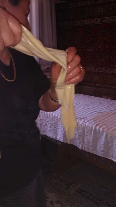 Soğuk suya buğday nişastası karıştıra karıştıra yedirilir. 15 dakika kısık ateşte topaklanmaması için karıştırılarak pişirilir, tepsiye dökülür. Soğuduktan sonra baklava şeklinde kesilir. Ayrı bir kapta pekmez bir miktar su ile inceltilir ve muhallebinin üzerine dökülür. Soğuk olarak servis edilir. Süslemek için tarçın kullanılır.