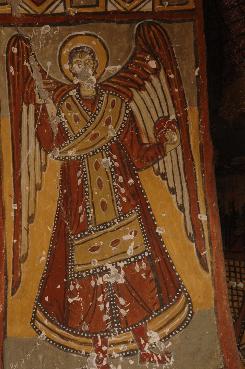 Freskolar 9'ncu yüzyıla veya 11'inci yüzyılın birinci yarısı ile 12'nci yüzyıl arasına tarihlenmektedir. Narteks tonozunda ve batı duvarında Son Yargı; kuzey duvarında -bugün mevcut olmayan bir sahne- Lazarus'un Diriltilmesi, Kudüs'e Giriş; doğudaki kemerin iç yüzeyinde ortada İsa, yanlarda melekler, alttaki payelerde kuzeyde Yoakim, Anna, güneyde Zekeriya, Elizabet; doğu haç kolunun tonozunda kuzeyde (Meryem’e) Müjde, güneyde Ziyaret; altında Ioannes Prodromos, loannes Khrysostomos; zafer kemeri doğu yüzünde Stephanos ve Gamaliel; iç yüzünde Süleyman, İlyas, Davud, Enok; ap¬sis kubbesinde İsa'nın Göğe Yükselişi; alttaki şeritte ortada tahtta Meryem ve Çocuk İsa, yanlarda Flavariler-Simeon, Thomas, Yahya, Lukas, Paulus, Petrus, Matta, Markus, Bartolomeus, Yakub, Philippus; kuzey haç kolu tonozun¬da batıda Basileios, doğuda Gregorios; duvarda altta Son Akşam Yemeği, üstte Çarmıhta İsa; güney haç kolu tonozunda batıda Athenogenes, doğuda Nikolaos, ortada Mikail ve Cebrail; duvarda altta Koimesis (Meryem’in ölümü), üstte Konstantin ve Helena; güneydeki dehlizin güney duvarında Mısırlı Meryem’in Komminyonu (takdisi), Mısırlı Meryem'in Gömülmesi; batı duvarında Daniel Arslanlar Arasında; kuzeydeki mezar şapelindeki arkosoliumda Deesis sahneleri izlenmektedir.