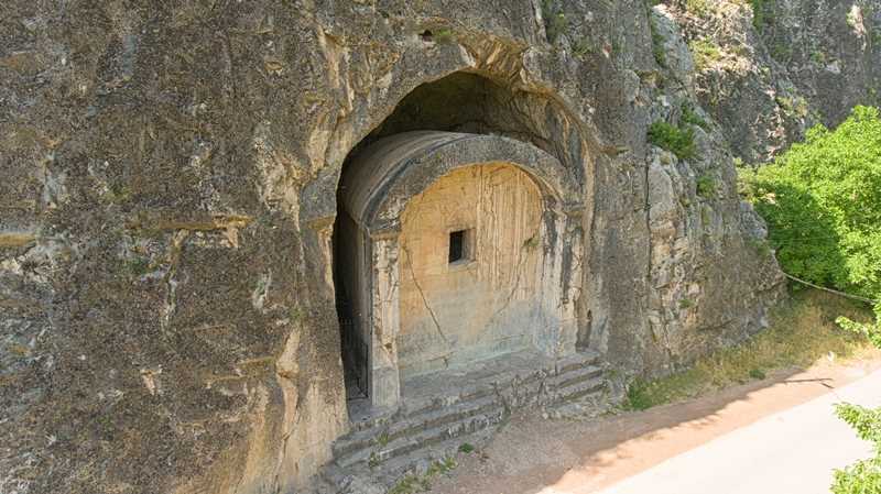 Aynalı Mağara Ziyaret Beldesi yolu üzerinde şehir merkezine 3,3 kilometre uzaklıktadır. Kaya mezarlarının en iyi işlenmiş ve tamamlanmış olanıdır. Yerden dört basamakla çıkılan mezar düz bir kayaya oyulmuştur. Genişliği 9,8 metre yüksekliği 13 metredir. Dış cepheden bakıldığı zaman usta bir taş işçiliği ile yapıldığı görülebilir. Mağaranın dış cephe yüzeyi perdahlanarak parlatılmıştır. Buraya Aynalı Mağara denmesinin nedeni de güneş vurduğu zaman mağaranın cephesinin parlamasıdır.