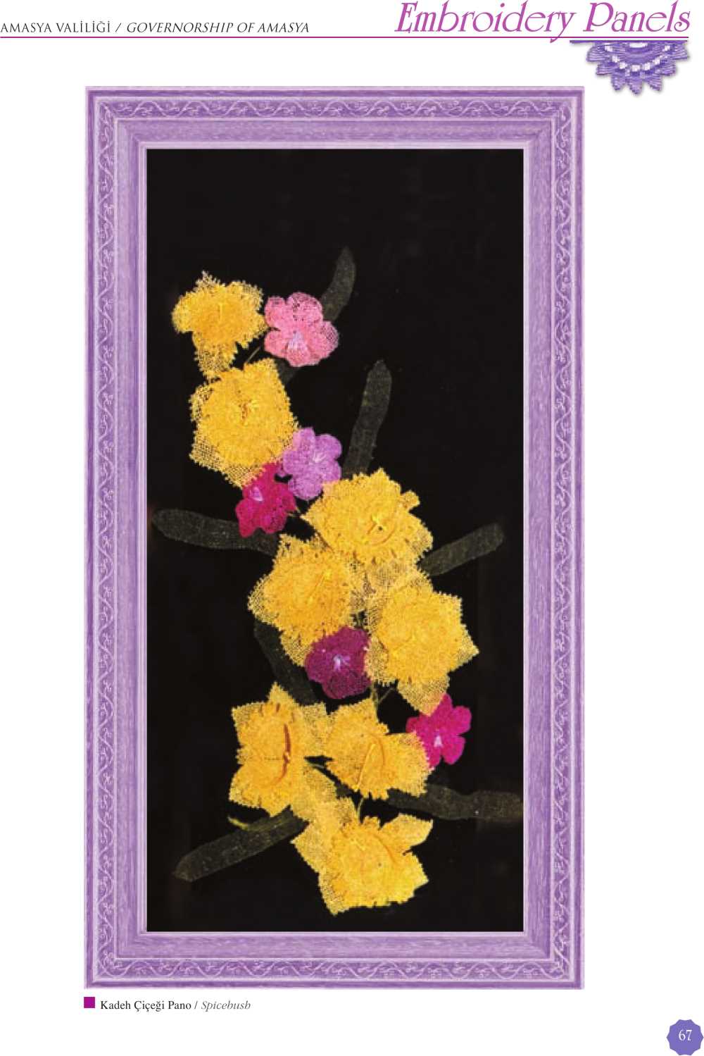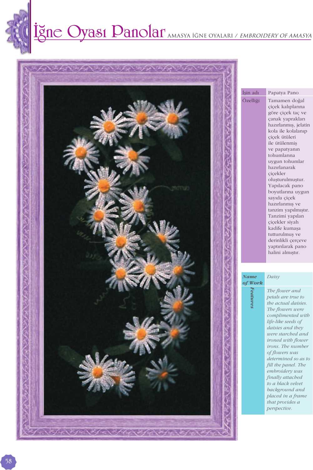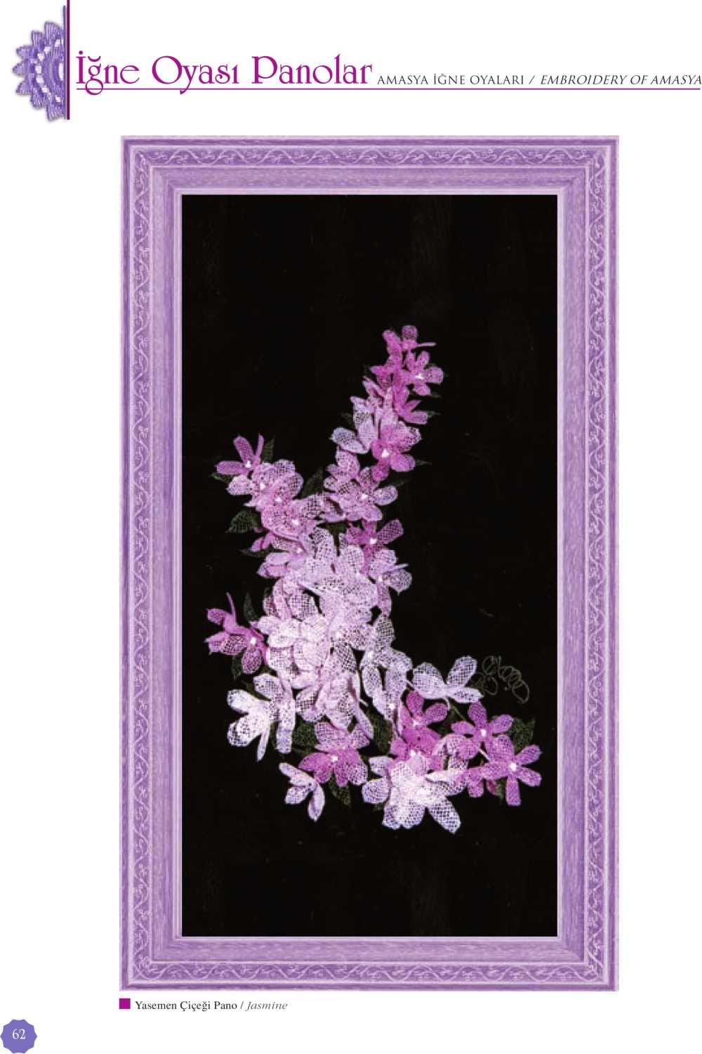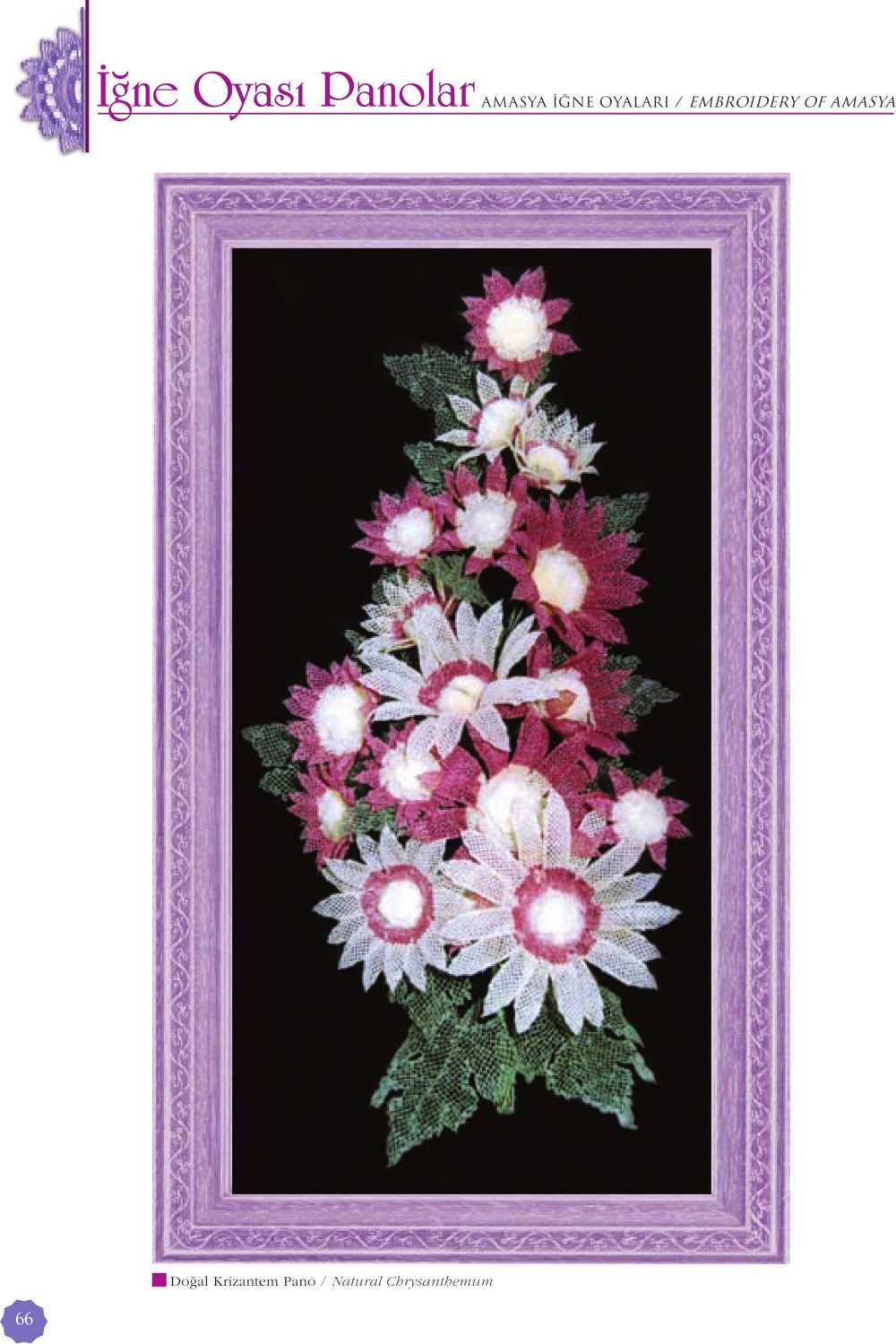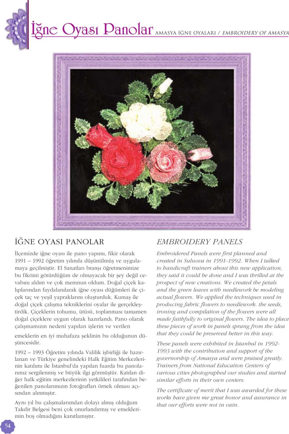 İğne oyası ile pano yapımı, fikir olarak 1991 – 1992 yılında düşünülmüş ve uygulamaya geçilmiştir. Doğal çiçek kalıplarından faydalanılarak iğne oyası düğümleri ile çiçek taç ve yeşil yaprakları oluşturulup kumaş ile doğal çiçek çalışma teknikleri oyalar ile gerçekleştirilmiştir. Çiçeklerin tohumu, ütüsü, toplanması tamamen doğal çiçeklere uygun olarak hazırlanmıştır.
