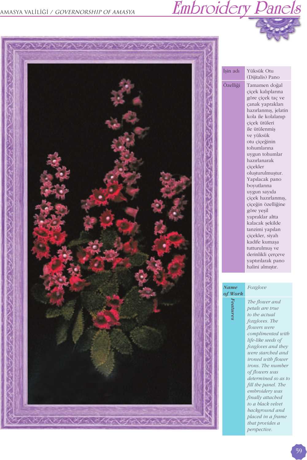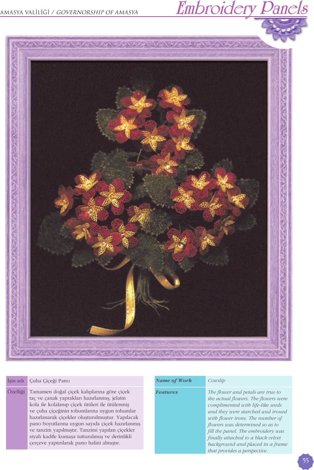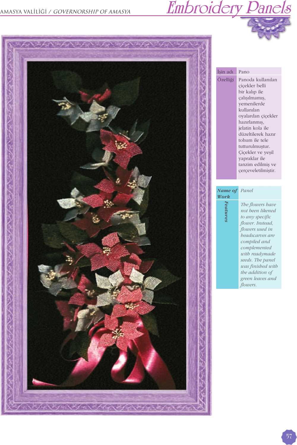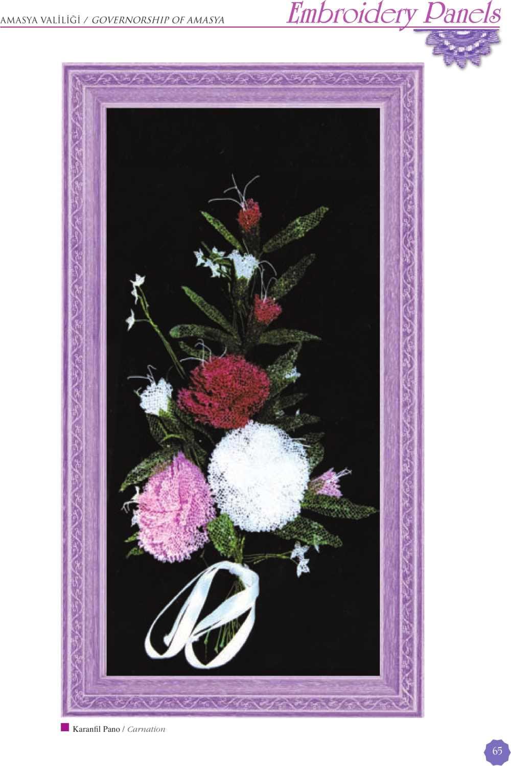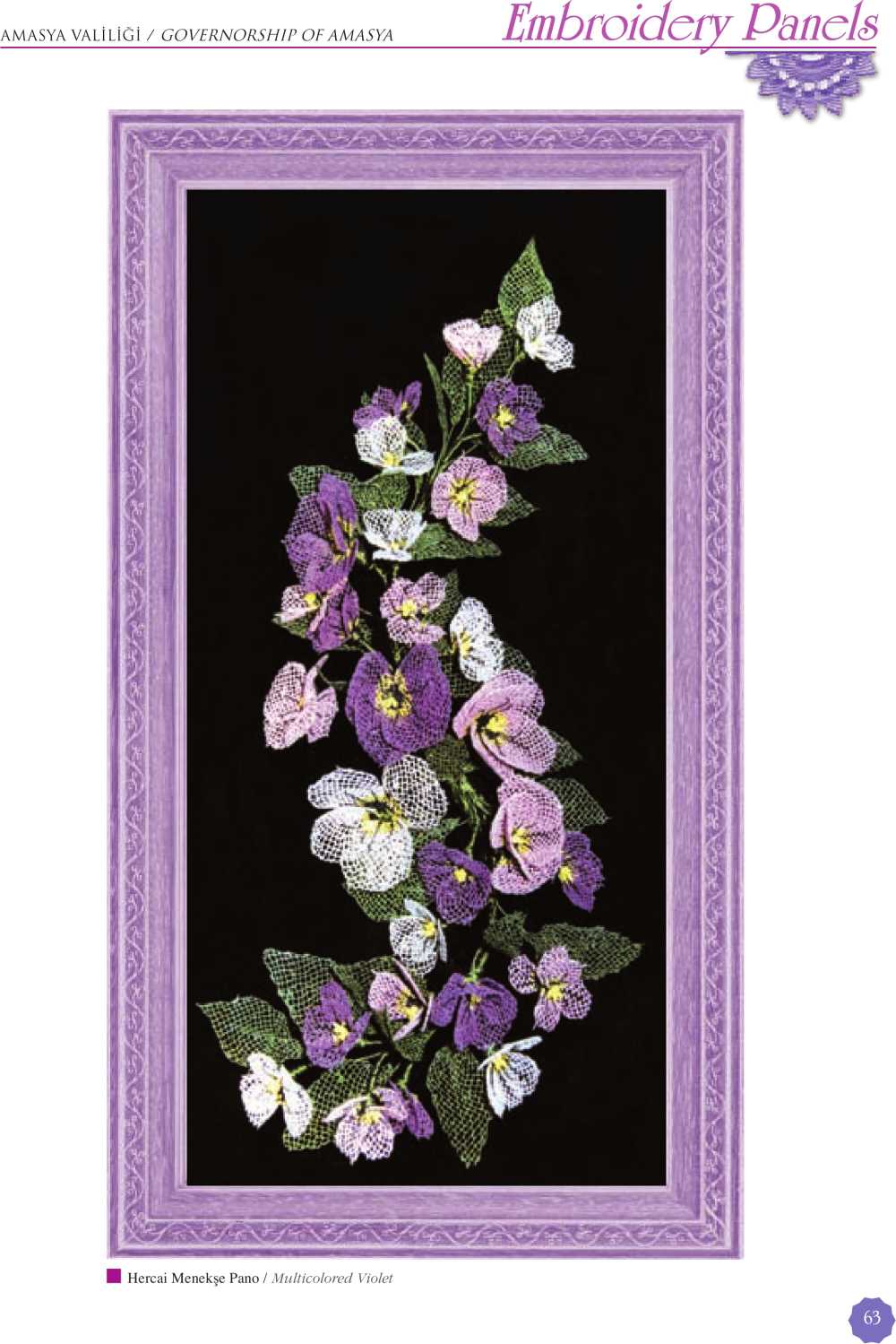 İğne oyası ile pano yapımı, fikir olarak 1991 – 1992 yılında düşünülmüş ve uygulamaya geçilmiştir. Doğal çiçek kalıplarından faydalanılarak iğne oyası düğümleri ile çiçek taç ve yeşil yaprakları oluşturulup kumaş ile doğal çiçek çalışma teknikleri oyalar ile gerçekleştirilmiştir. Çiçeklerin tohumu, ütüsü, toplanması tamamen doğal çiçeklere uygun olarak hazırlanmıştır.