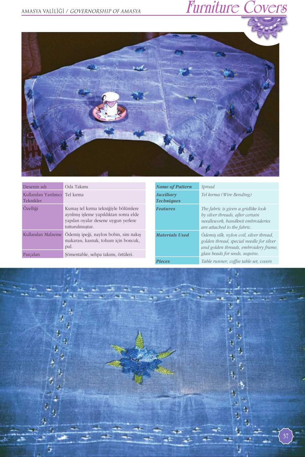 - Özelliği: Kumaş tel kırma tekniğiyle bölümlere ayrılmış işleme yapıldıktan sonra elde yapılan oyalar desene uygun yerlere tutturulmuştur.
