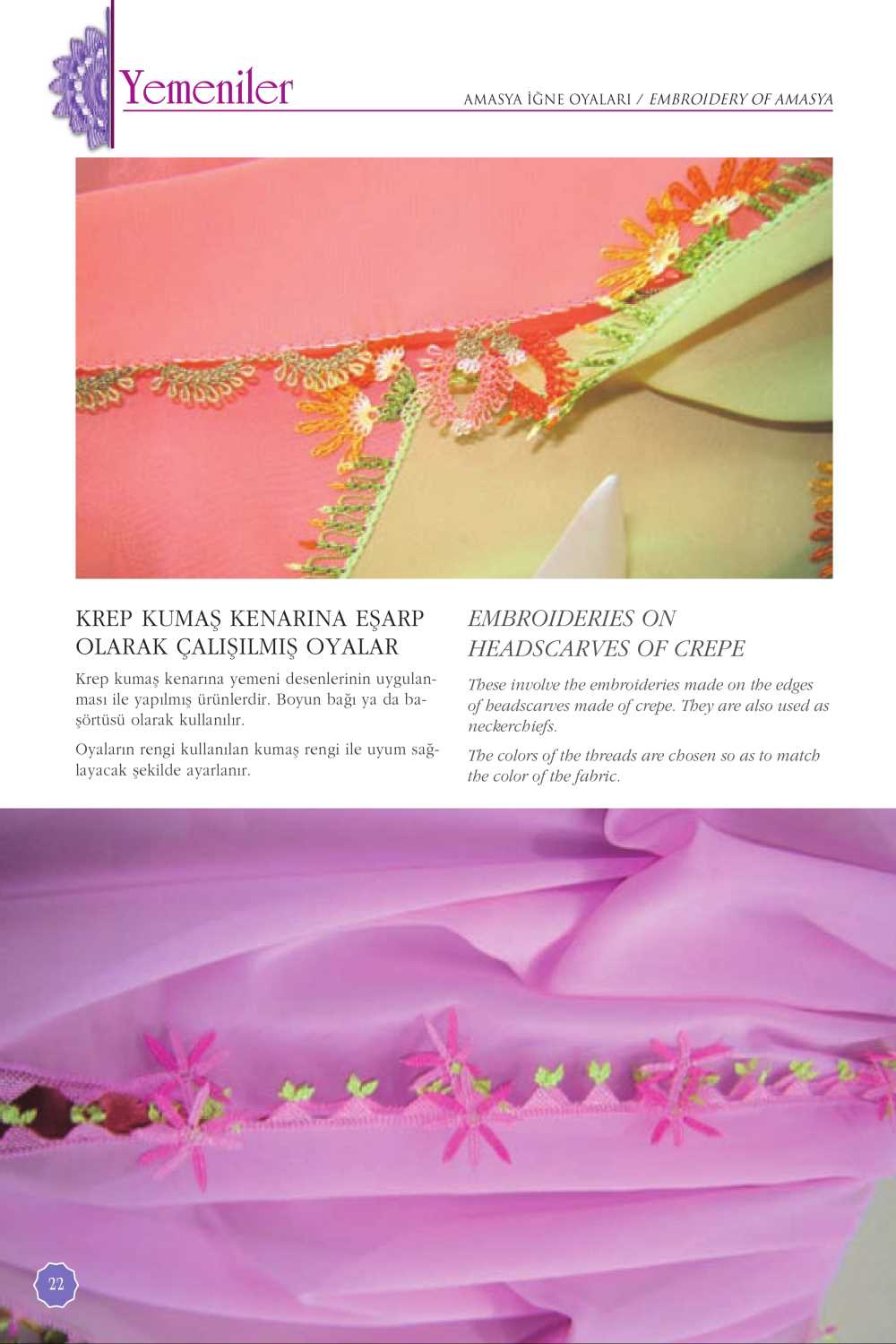 Krep kumaş kenarına yemeni desenlerinin uygulanması ile yapılmış ürünlerdir. Boyun bağı ya da başörtüsü olarak kullanılır. Oyaların rengi kullanılan kumaş rengi ile uyum sağlayacak şekilde ayarlanır
