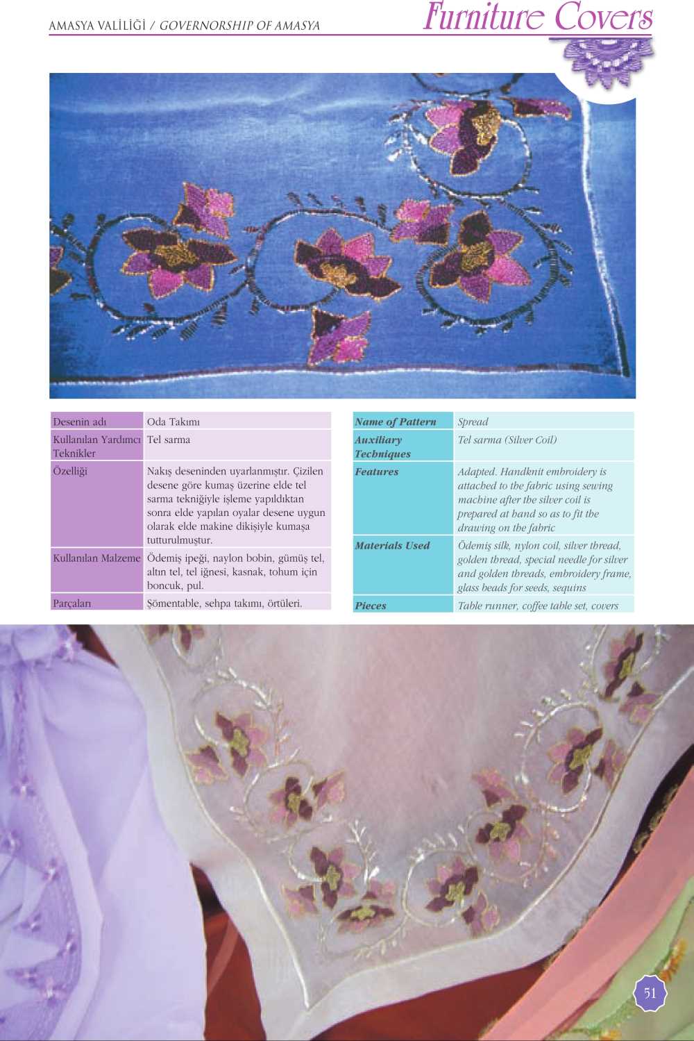 Özelliği: Nakış deseninden uyarlanmıştır. Çizilen desene göre kumaş üzerine elde tel sarma tekniğiyle işleme yapıldıktan sonra elde yapılan oyalar desene uygun olarak elde makine dikişiyle kumaşa tutturulmuştur.