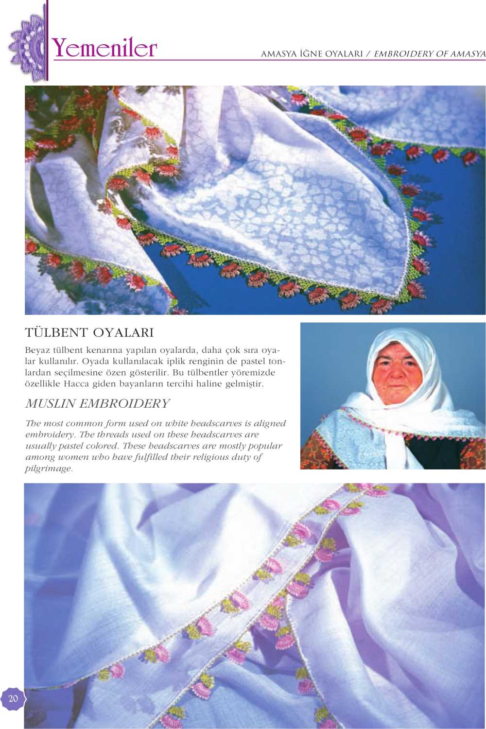 Beyaz tülbent kenarına yapılan oyalarda, daha çok sıra oyalar kullanılır. Oyada kullanılacak iplik renginin de pastel tonlardan seçilmesine özen gösterilir. Bu tülbentler yörede özellikle Hacca giden bayanların tercihi haline gelmiştir