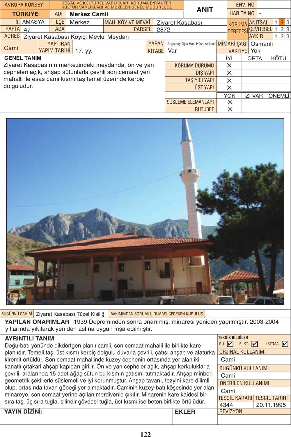 1939 Depreminden sonra onarılmış, minaresi yeniden yapılmıştır. 2003-2004