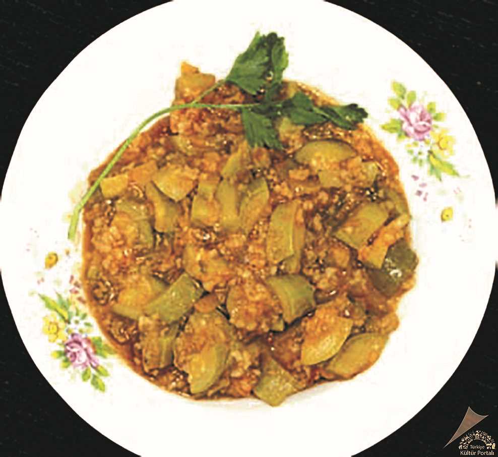 Bir tavada soğan ve kıyma kavrulur. Salça ve pirinç ilâve edilir. Sahana halka şeklinde kesilmiş kabaklar dizilip üzerine ve aralarına yukarıda hazırlanan malzeme serilir. Karabiber, tuz, kırmızı biber, 1 çay bardağı su katılıp kısık ateşte pişirlir. NOT: İstenirse sarımsaklı yoğurt üzerine dökülür.