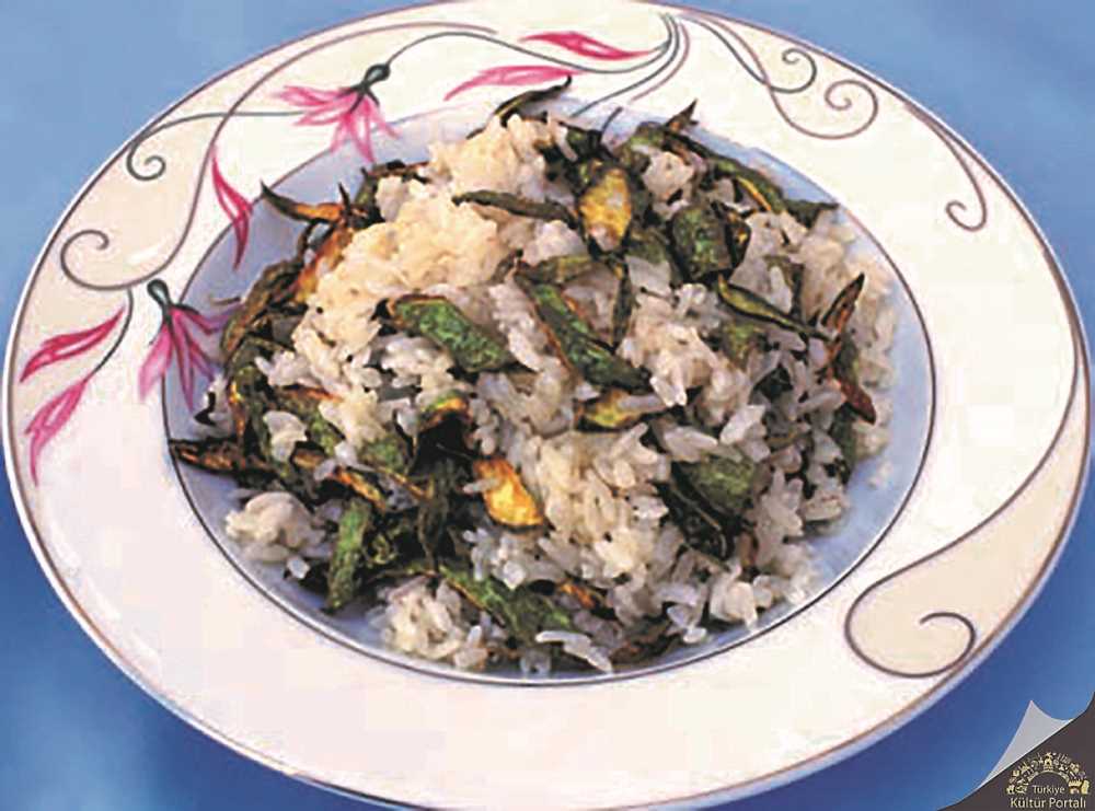 Kabaklar yıkanır, kurulanır. Kabukları boyuna şerit halinde kalınca kesilir. Kibrit çöpü kalınlığında doğranır. Yağda soğan ve kıyma kavrulur. Doğranmış kabak kabukları ilave edilerek hoplatılarak soldurulur. Tencerenin ortası açılarak (ayıklanıp, yıkatılmış ve ıslatılmış) pirinç, tuz ilave edilir. Üzeri kapatılır. 1 çay bardağı sıcak su pirinçlerin üzerine eklenir. Kısık ateşte pişirilen pilav 20 dakika demlenmeye bırakılır, üzerine karabiber ekilerek servis yapılır.