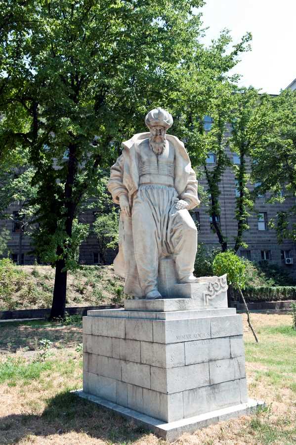 Dil ve Tarih-Coğrafya Fakültesi’nin bahçesinde yer alır. 1956 yılında Türkiye Emlak ve Kredi Bankası tarafından heykeltıraş Hüseyin Anka’ya yaptırılmıştır. Atatürk’ün, Türk Tarih Araştırma Kurumu’na ilettiği ve sözlerini kendi el yazısı ile “T.T.A.K. Sinan’ın heykelini yapınız. K.Atatürk: VIII 1935 saat 22.50” şeklinde yazdığı vasiyetini, sadece bu banka yerine getirmiştir. Heykelin ağırlığı 7 ton ve tabanı ile birlikte yüksekliği 4.30 metredir. Mermer tabanının ön yüzünde “Mimar Koca Sinan 1490–1588 Türkiye Emlak Kredi Bankasının ilim ve sanat camiasına armağanıdır” oyma yazısı vardır. Tabını üzerinde ünlü mimarımız Mimar Sinan’ın (1490–1588) ayakta duran, kendisine has giysileriyle mermer heykeli bulunmaktadır.