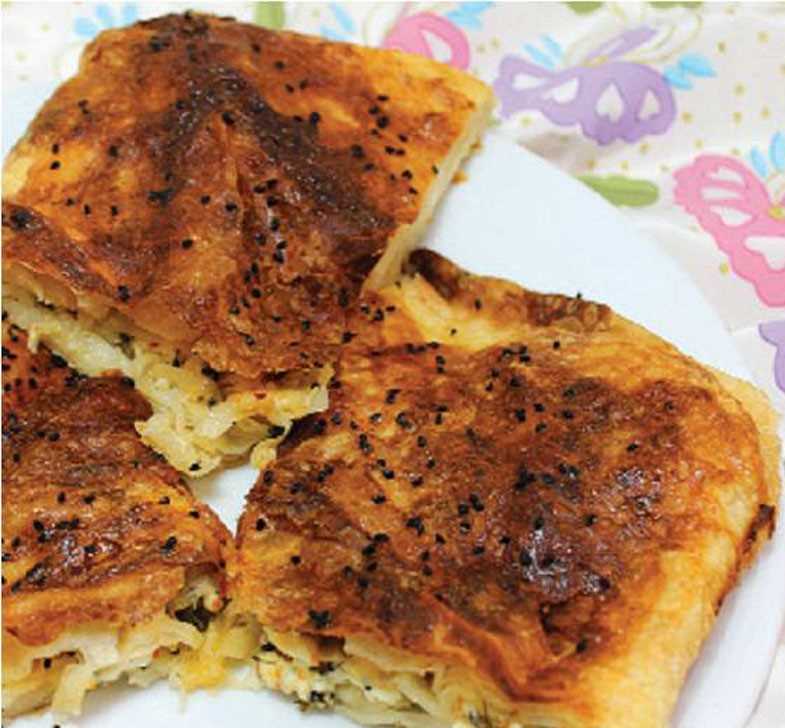 Tüm malzemeler hep birlikte, sert baklavalık hamur gibi yoğrulur ve 6 pazıya ayrılır. Daha sonra 15-20 dakika dinlendirilir. Ayrılan her bir pazı baklava gibi açılır. Açılan hamurun içine yemek kaşığı ile sıvı yağ sürülür. Hamur alttan ve üstten yarım daireye yakın birbirlerinin üstüne gelecek şekilde katlanır. Sonra sağdan ve soldan aynı şekilde uçlar üste gelecek şekilde katlanarak kare biçimi verilir. Hazırlanan börek içi karenin ortasına getirilerek köşelerden içe doğru bohça şeklinde katlanır. Hamurun açılmaması için merkezde birleşen dört ucun üstüne parmakla basılır. Bohça şeklini alan hamur tavada az yağda iki taraflı gevrekçe kızartılarak servise hazır hale getirilir.