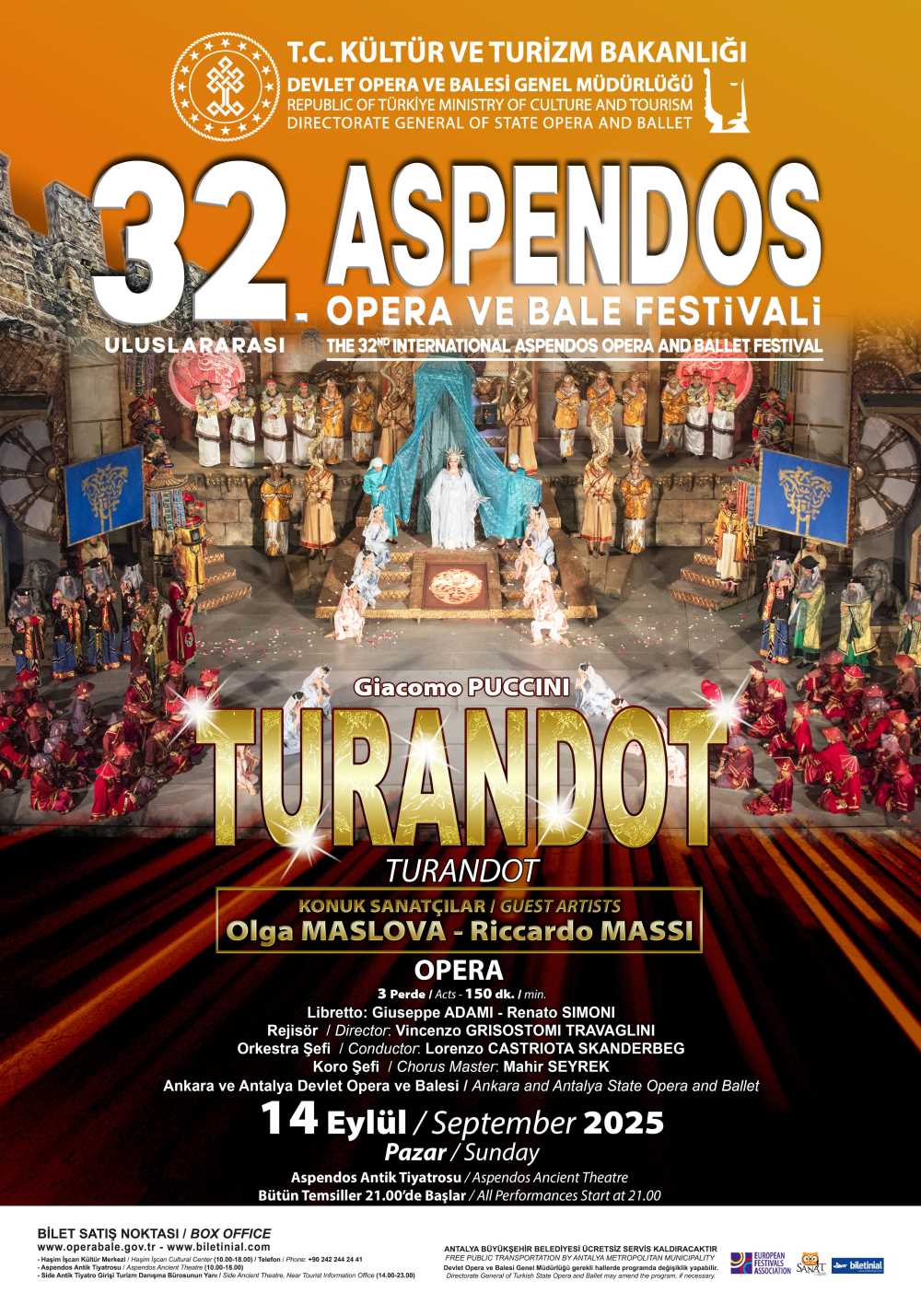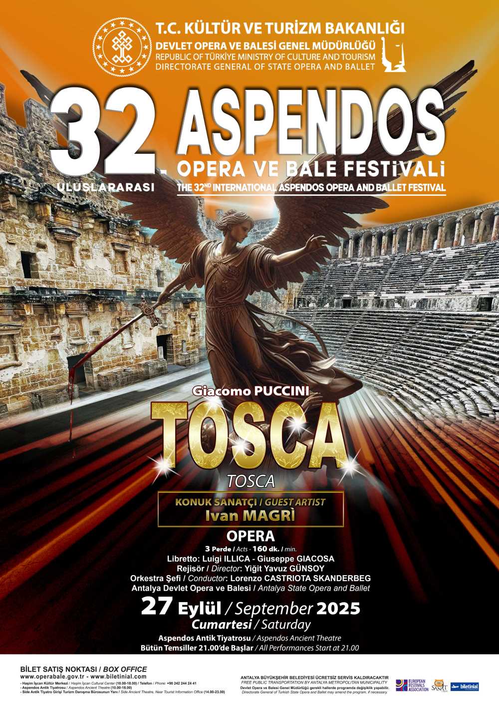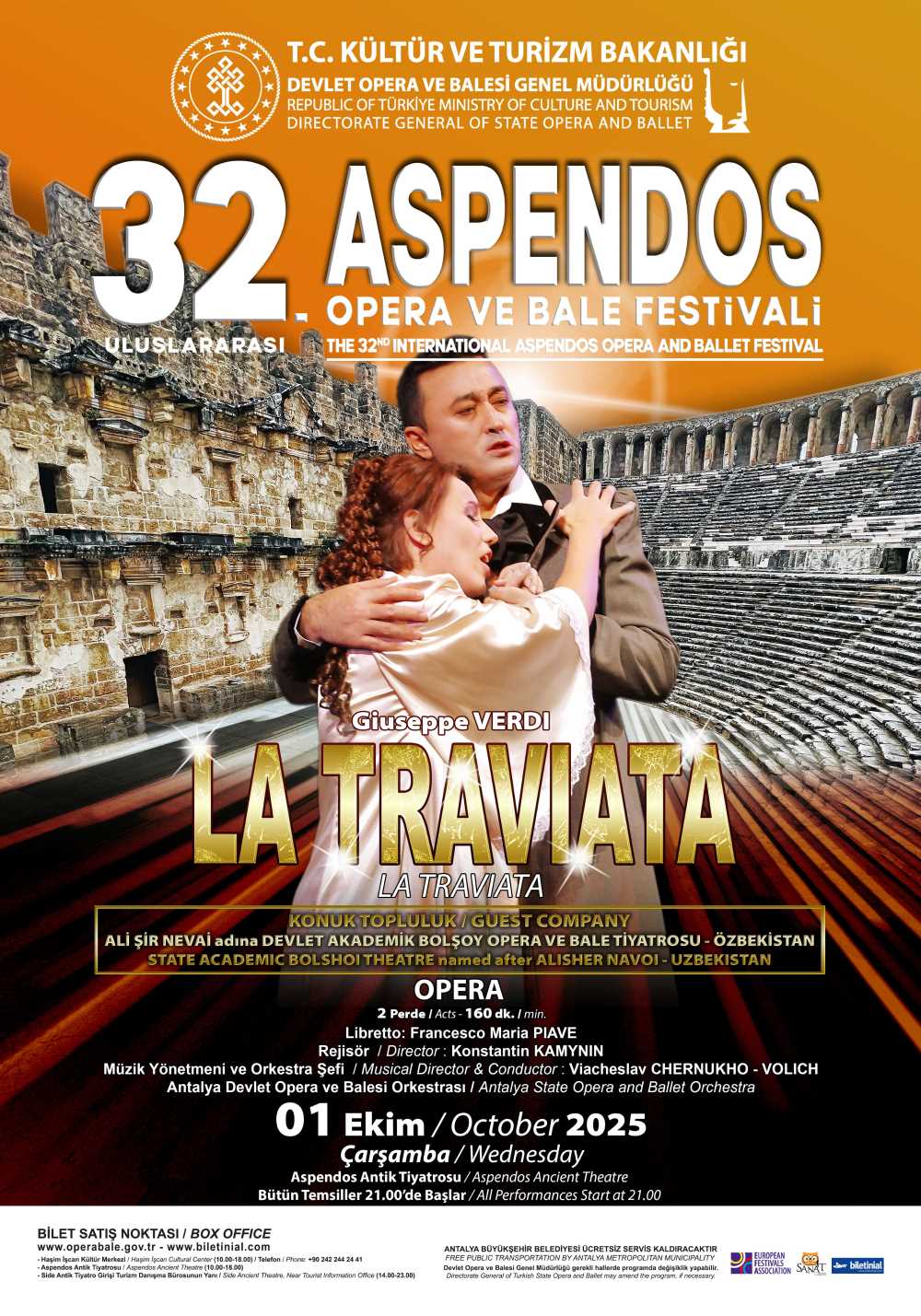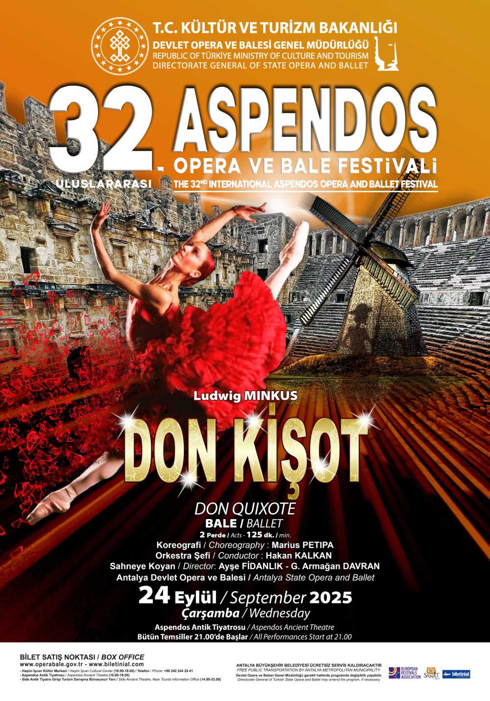 T.C. Kültür ve Turizm Bakanlığı Devlet Opera ve Balesi Genel Müdürlüğü tarafından düzenlenen Uluslararası Aspendos Opera ve Bale Festivali, bu yıl 32. kez sanatseverlerle buluşuyor. 14 Eylül – 1 Ekim 2025 tarihleri arasında düzenlenecek olan festival, 2000 yılı aşkın geçmişe sahip Aspendos Antik Tiyatrosu’nun büyüleyici atmosferinde gerçekleşecek.